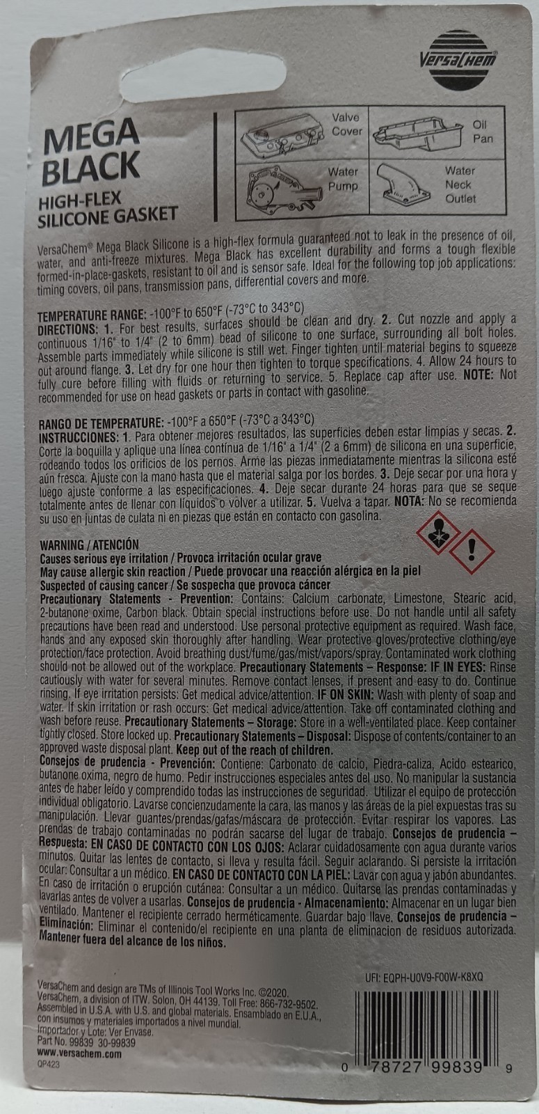 Versachem Mega Black Silicone is a high performance, moisture curing gasketing material that cures into a strong, silicone rubber to make formed-in-place gaskets. Maintains long term durability and flexibility, and will not harden, shrink or crack. Forms a tough, flexible silicone rubber gasket that resists aging and weathering. Works best on silicone, cork, felt and rubber gaskets. This black, waterproof, low odor formula is non-corrosive to steel, iron and aluminum, oxygen sensor safe, low volatile, non-toxic, non-flammable and OEM (Original Equipment Manufacturer) approved. Tensile strength of 240 PSI, and temperature range of -65F to 400F (continuous); -65F to 650F (intermittent)