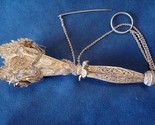 Gorgeous handmade silverplate filigree tripod tussie mussie with 3-D flowers and chains. There are five large 3-D peony or poppy type flowers, each with two chains connecting. The bottom of the handle has a screw-off ball, and when removed there are three spring action legs for a tripod to stand. Many layers of filigree wirework. Excellent condition, heavy and well made. It measures 5 1/2" long and 1 1/2" in diameter. Has the ring and pin. It dates from about 1900-20's. Remarkable!
