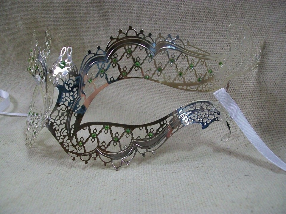 Baroque Renaissance Venetian or Masquerade Costume eye mask. Metal mask with colored stones. Metal may need gentle shaping / bending. Has fabric ties on the sides to tie mask on. Covers only eye area of the face. This type of mask is great for parties because it is easy to wear while talking, eating, or drinking. One Size Fits Most. Not suitable for children under 12 years of age.
