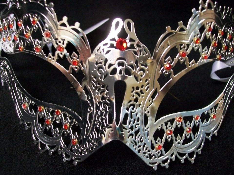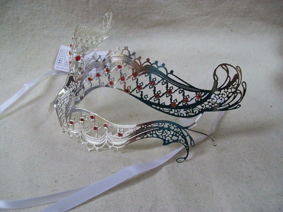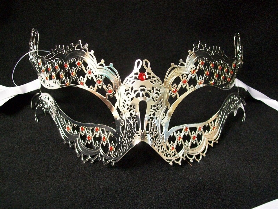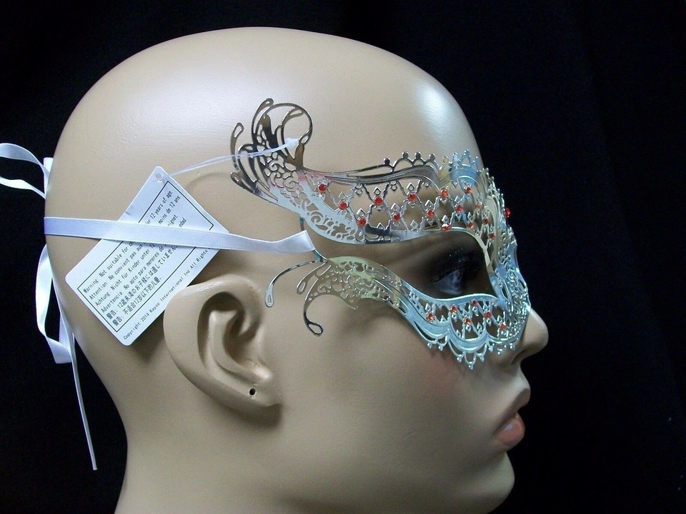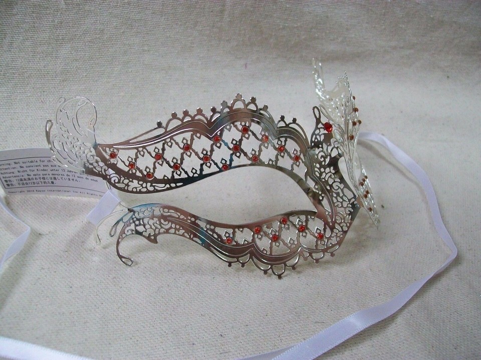Baroque Renaissance Venetian or Masquerade Costume eye mask. Metal mask with colored stones. Metal may need gentle shaping / bending. Has fabric ties on the sides to tie mask on. Covers only eye area of the face. This type of mask is great for parties because it is easy to wear while talking, eating, or drinking. One Size Fits Most. Not suitable for children under 12 years of age.