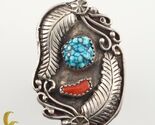 - Silver Navajo Ring with Coral & Turquoise and Hand-Made Leaf Motif Size 4.75