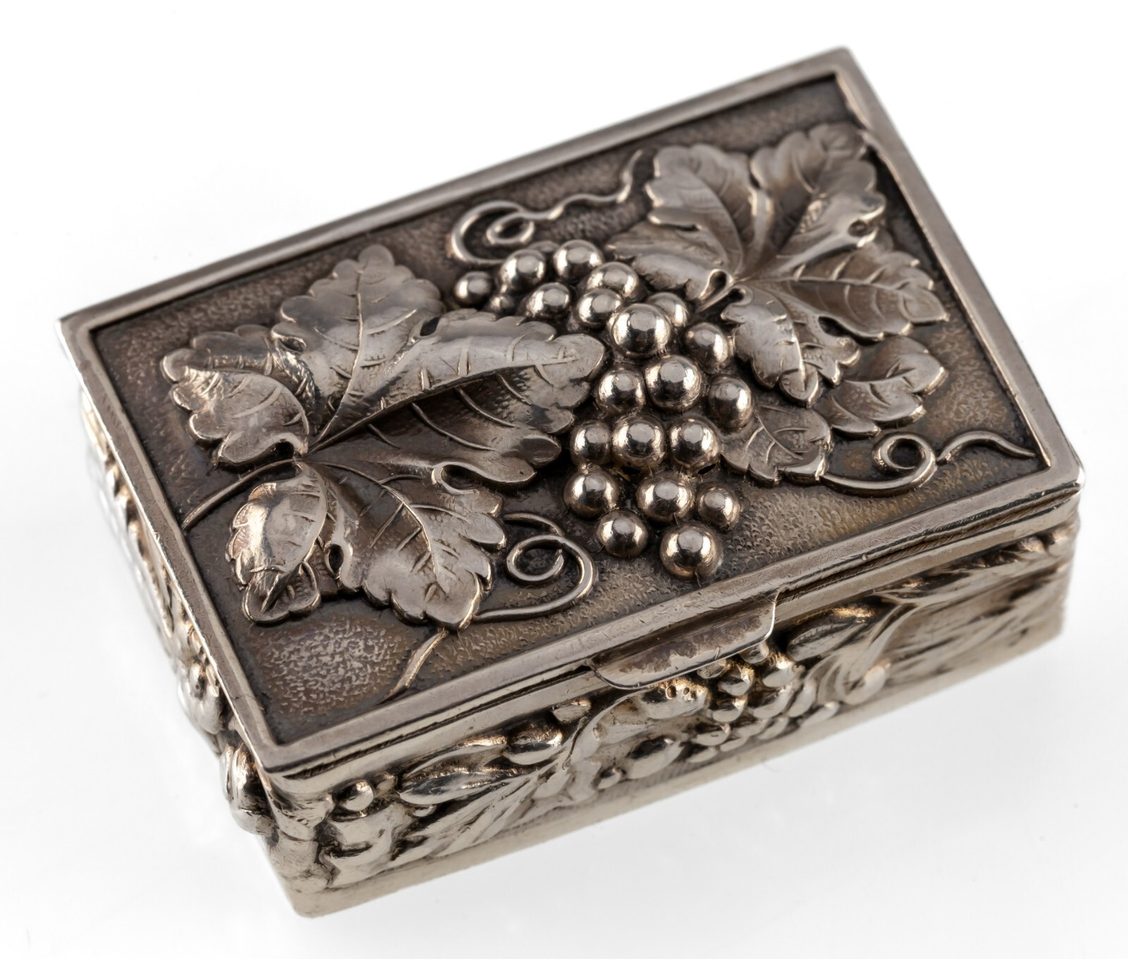 Silver Pill Box with Repousse Graps and other Motifs Adorable