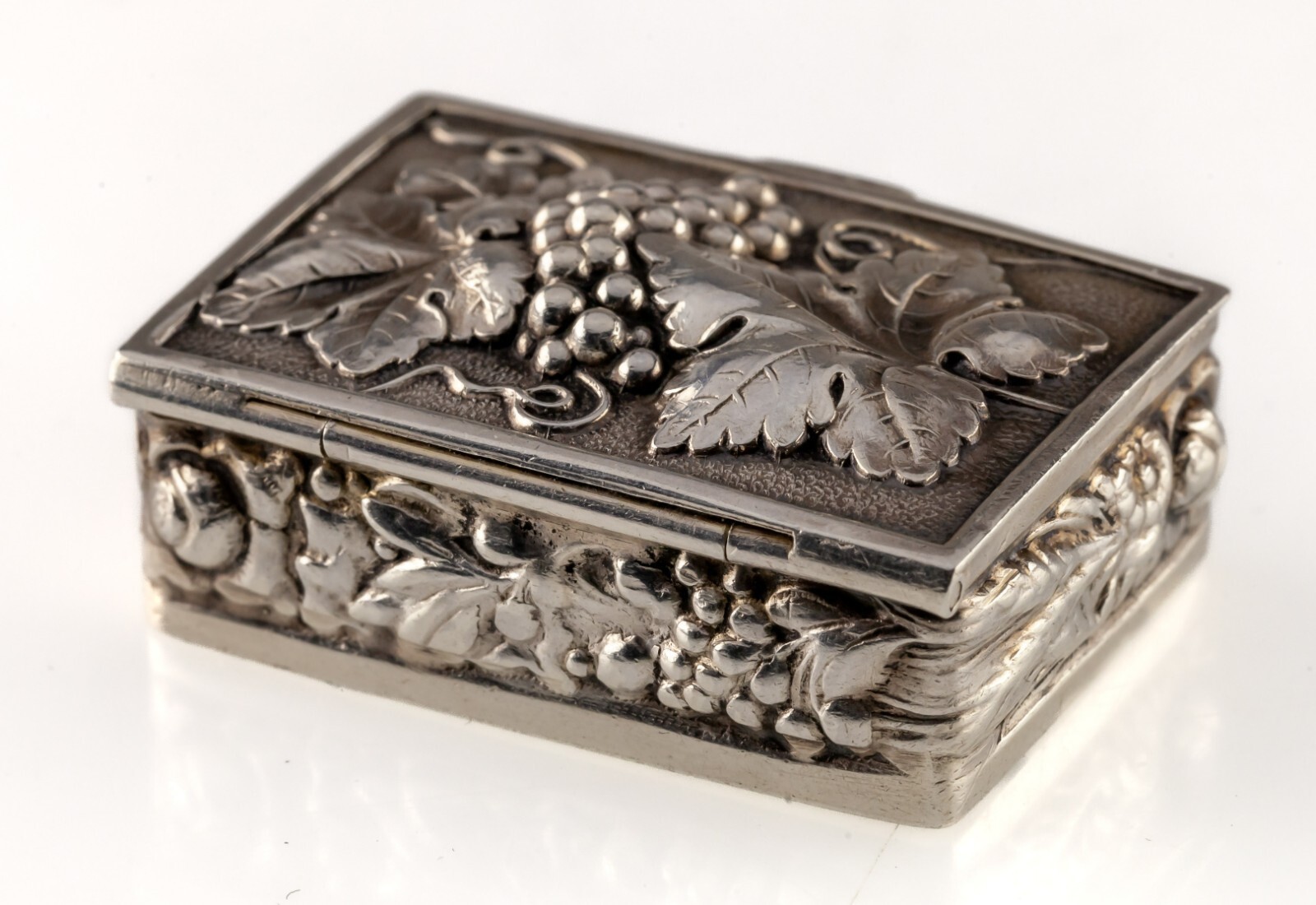 Primary image for Silver Pill Box with Repousse Graps and other Motifs Adorable