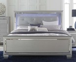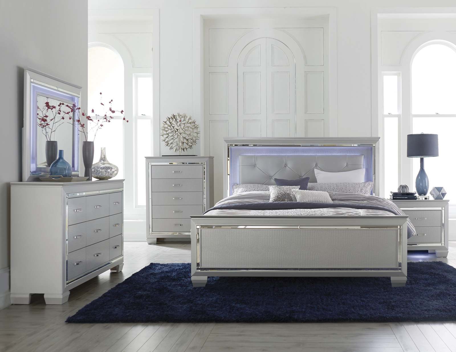 Glamour reigns in the design of the Allura Collection. Framing the Queen bed is a decorative beveled mirror accent that enhances the illumination from the touch-engaged LED backlight of the headboard and mirror, as well as the under-light of the night stand. The silver faux leather crystal-tufted headboard insert boldly accents the silver finish.
