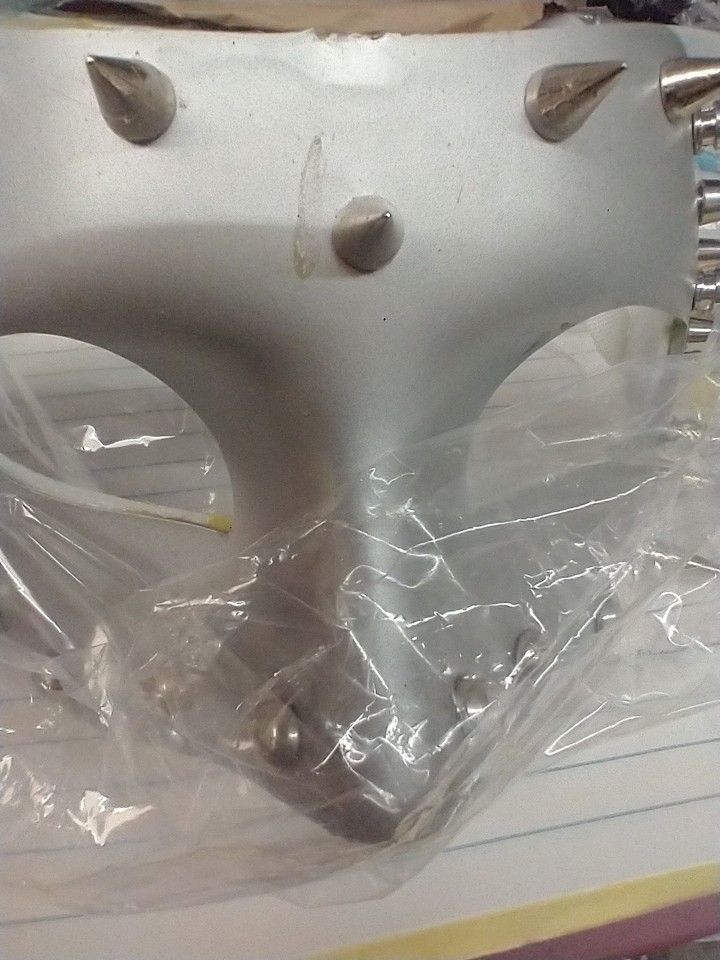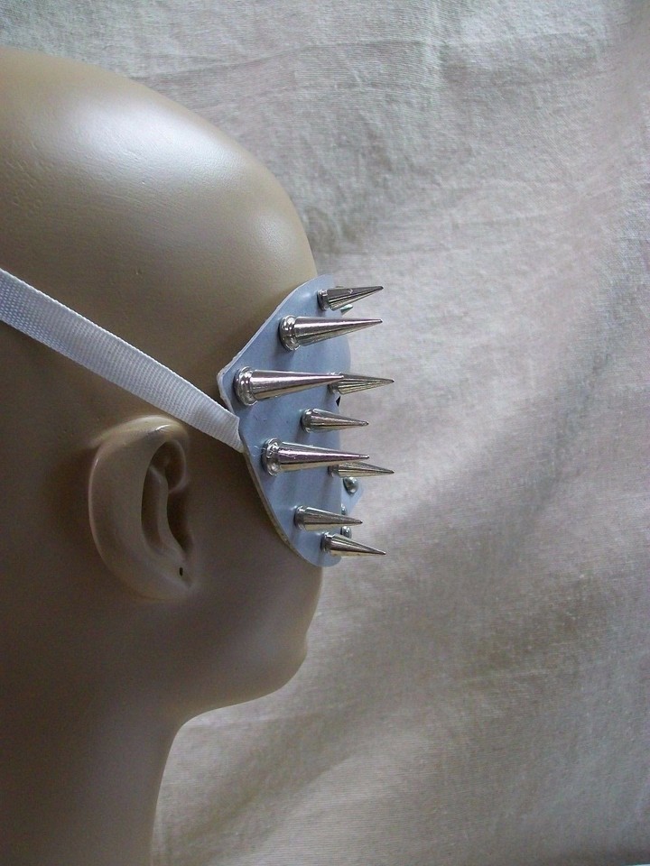 Punk Spiked eye mask. Matte Silver with Silver Spikes and studs. Has fabric ribbons on the sides to tie mask on. Looks like it is made of a heavier plastic. Covers only Front of the face. Has spikes of various lengths. Mask is a bit heavier than some due to all the spikes. Adult Use. One Size Fits Most. Not tags. No age specs but most costume items are for ages 14 and up.