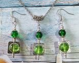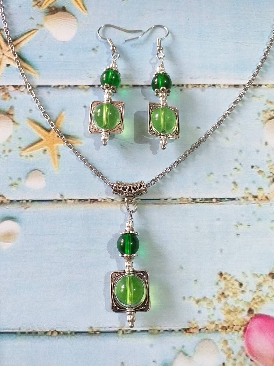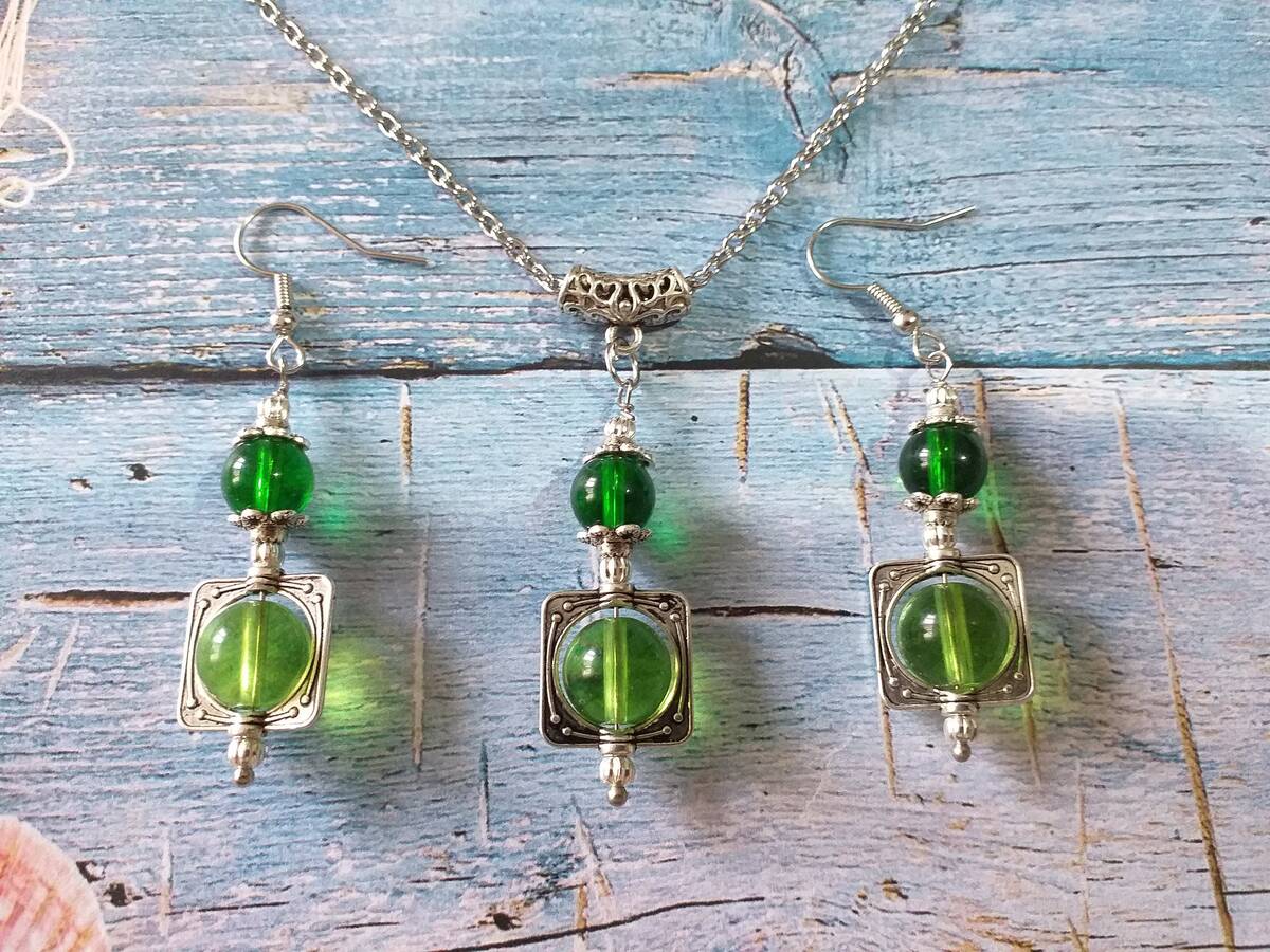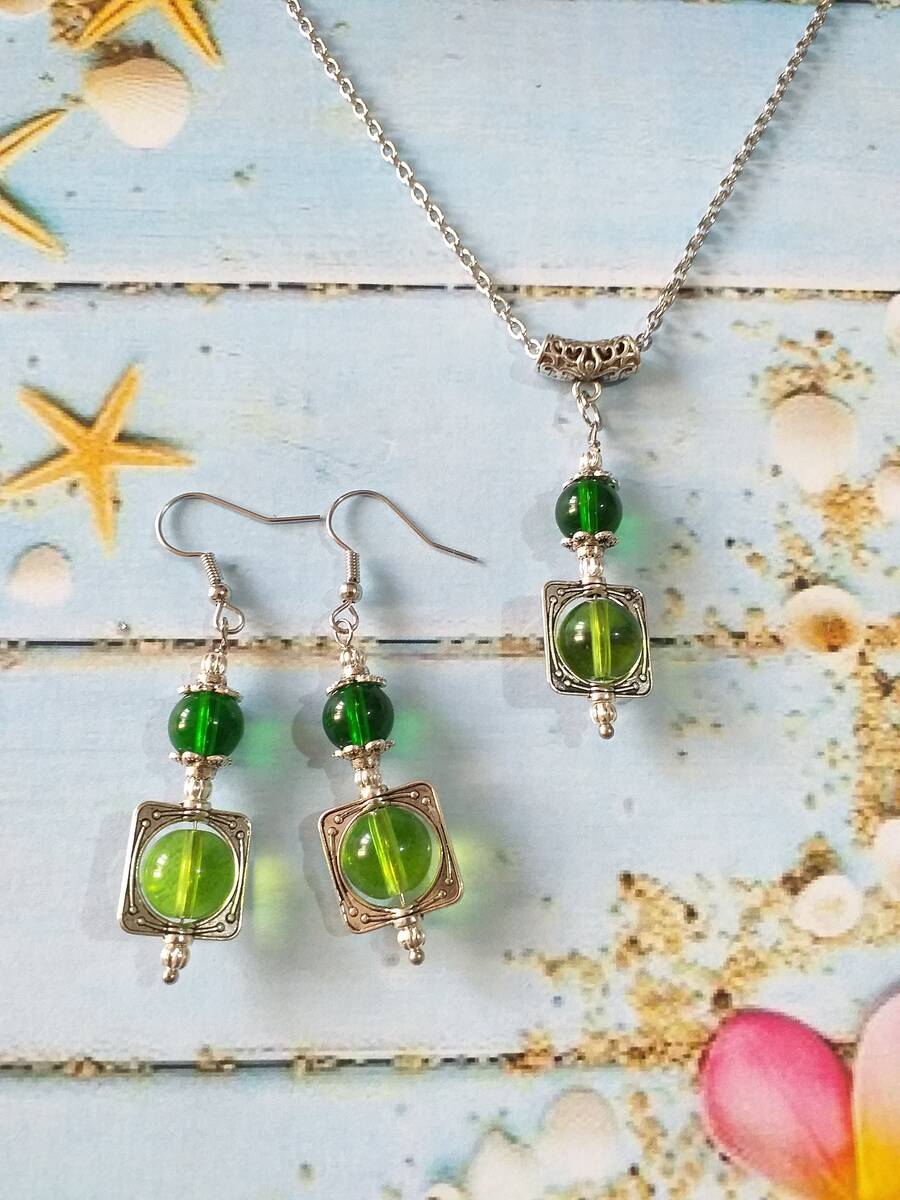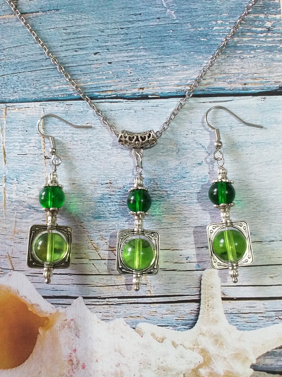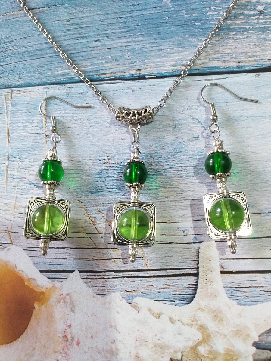 Beautiful Set of silver-tone Antique style Emerald green glass beads necklace and earrings in silver-toned ornament frame. Silver tone pendant Victorian style necklace and earrings. Boho necklace. Bohemian necklace and earrings. Romantic necklace and earrings. Beautiful necklace with same style earrings with fine green glass beautiful beads and elegant silver-toned ornaments and frames .