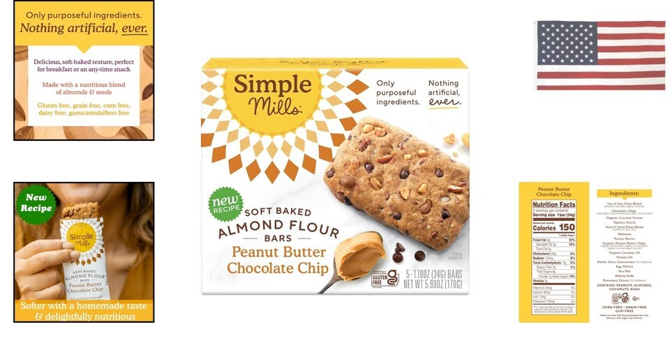 Simple Mills Peanut Butter Chocolate Chip Almond Flour Snack Bars, Gluten Free, 5 Count (5.95 oz), Pack of 1