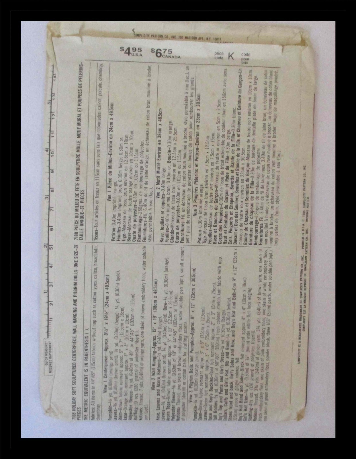 The Simplicity Crafts 7188 Soft Sculpture Centerpiece, Wall Hanging Pilgrim Dolls is a sewing pattern that focuses on creating home decor and seasonal items. The pattern includes designs for a soft sculpture centerpiece, wall hanging, and pilgrim dolls, offering a variety of creative projects for crafting enthusiasts. With an uncut status, this pattern allows for endless possibilities to customize and personalize your creations. Perfect for those looking to add a handmade touch to their living space during the holidays or special occasions. Same or next day ship.