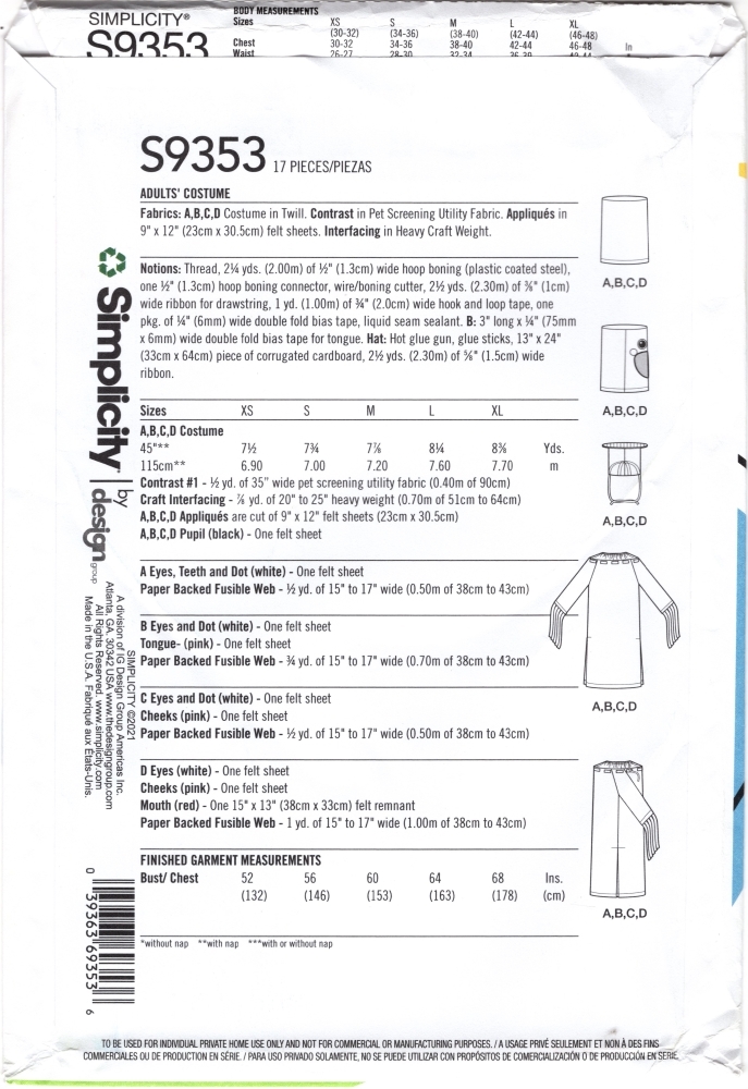2021 Simplicity S9353 - Waving Tube People Costumes - Sizes XS, S, M, L XL - Uncut Pieces and instructions to make: Costume plus Hood with various Faces Pattern is Factory Folded, Complete and Uncut. See picture of back of pattern for fabric and notion information. Package Weight: 6 oz. Be sure to check out my shipping policies for more information about services used and both domestic and international rates. Visit my booth for China, Stoneware, Glassware, Collectables, Books, Patterns More. Should ship within 3 business days after receiving payment. I will combine shipping and will refund the difference. I am not an expert. If I have misidentified this item, please let me know so I can fix it. I look over everything carefully and will include a picture of any flaw if I can and will always mention it. Please e-mail me with any questions about this item or options or more pictures. If there is ANY problem with your transaction or product contact me BEFORE leaving negative or neutral feedback and allow me the opportunity to make it right!