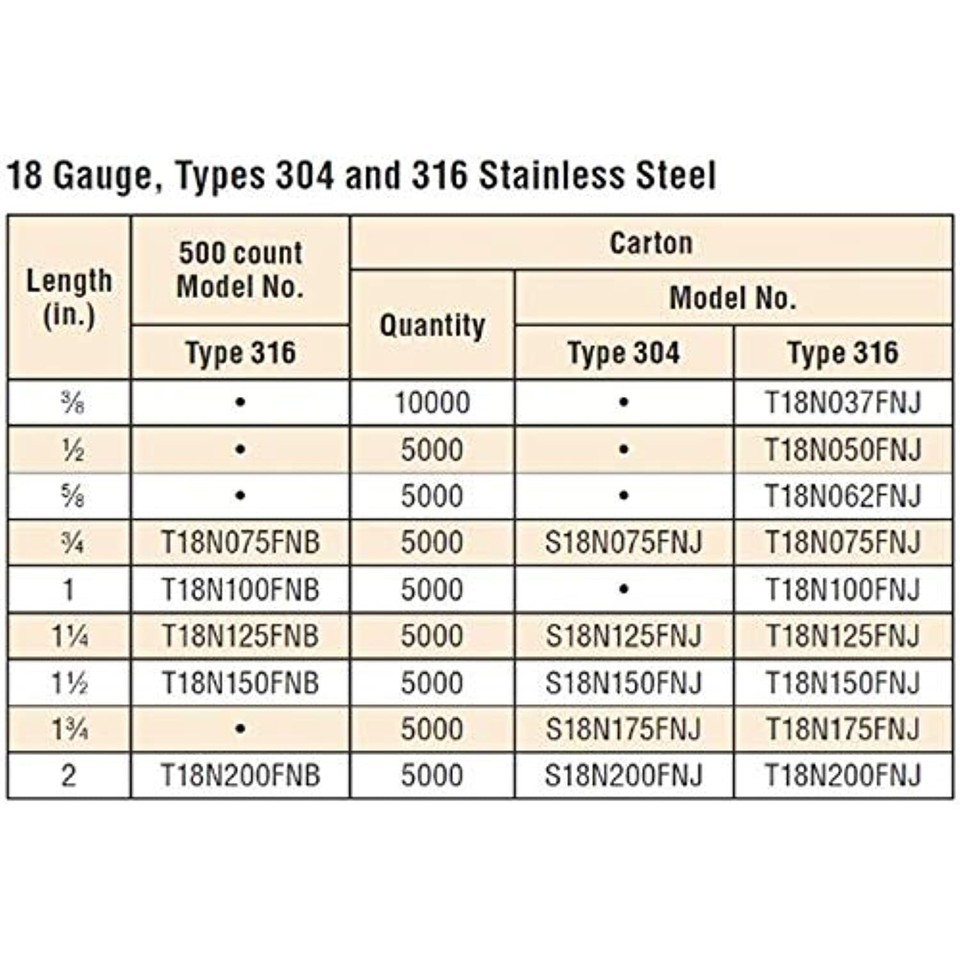 Simpson Strong-Tie T18N125FNB 1-1/4" 18ga 316SS Straight Finish Nails 500ct Product Description For finishing, millwork and trim applications. Type 316 stainless steel for seaside applications and superior corrosion resistance. Fits Bostitch, DeWalt, Hitachi, Paslode, Porter Cable and other compatible 18-Gauge brad nailers. Length: 1-1/4" 500 count 18 gauge T-style head Adhesive collated For finishing, millwork and trim applications Type 316 stainless steel for seaside applications and superior corrosion resistance Fits Bostitch, DeWalt, Hitachi, Paslode, Porter Cable and other compatible 18-Gauge brad nailers. From the Manufacturer Simpson Swan Secure T18N125FNB 316 Stainless Steel 18-Gauge Brad Nails contain more Nickel than a comparable 304SS fastener. This increases the corrosion protection in the harshest environments. Simpson Swan Secure 316 stainless steel nails are manufactured with very high steel tensile strengths ranging from 125,000 to 145,000 pounds per square inch making them leaders in the industry. Convenient 500 count packs are an economical way to purchase 316 stainless steel fasteners. Features 316 Stainless Steel for maximum corrosion protection in the harshest environments 1-1/4-Inch 18-Gauge brad nails 500 Per Box Fits Bostitch, DeWalt, Hitachi, Paslode, Porter Cable and other compatible 18-Gauge brad nailers USA SHIPPING estimates delivery times and we work to get your item to you as quickly as possible and within those times, but please know it may take slightly longer than the estimate.