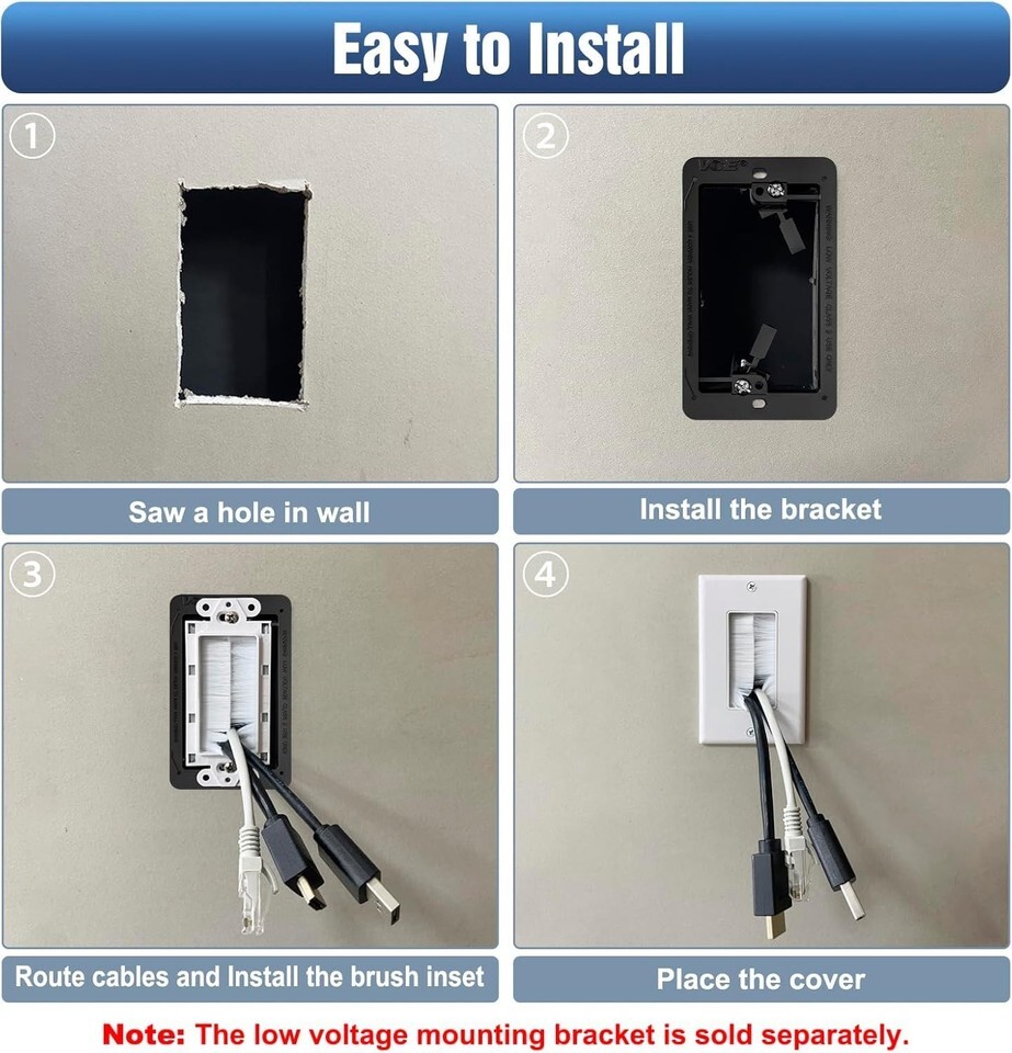 Designed to accommodate HDMI cables, coaxial cables, standard A/V cables, speaker wires, network RJ45 cables, and other low-voltage cables.