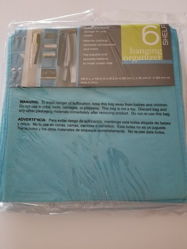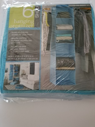 This sale is for a Six (6) Shelf Hanging Organizer Measures11.8" x 11.8" square x 47.2" long No Tools Required Turn a jumbled mess into a well organized closet Top adjusts securely fastens to most closet rods Aqua in color Organizer is new in original packaging Please view photos for a good description of this item Thank you!