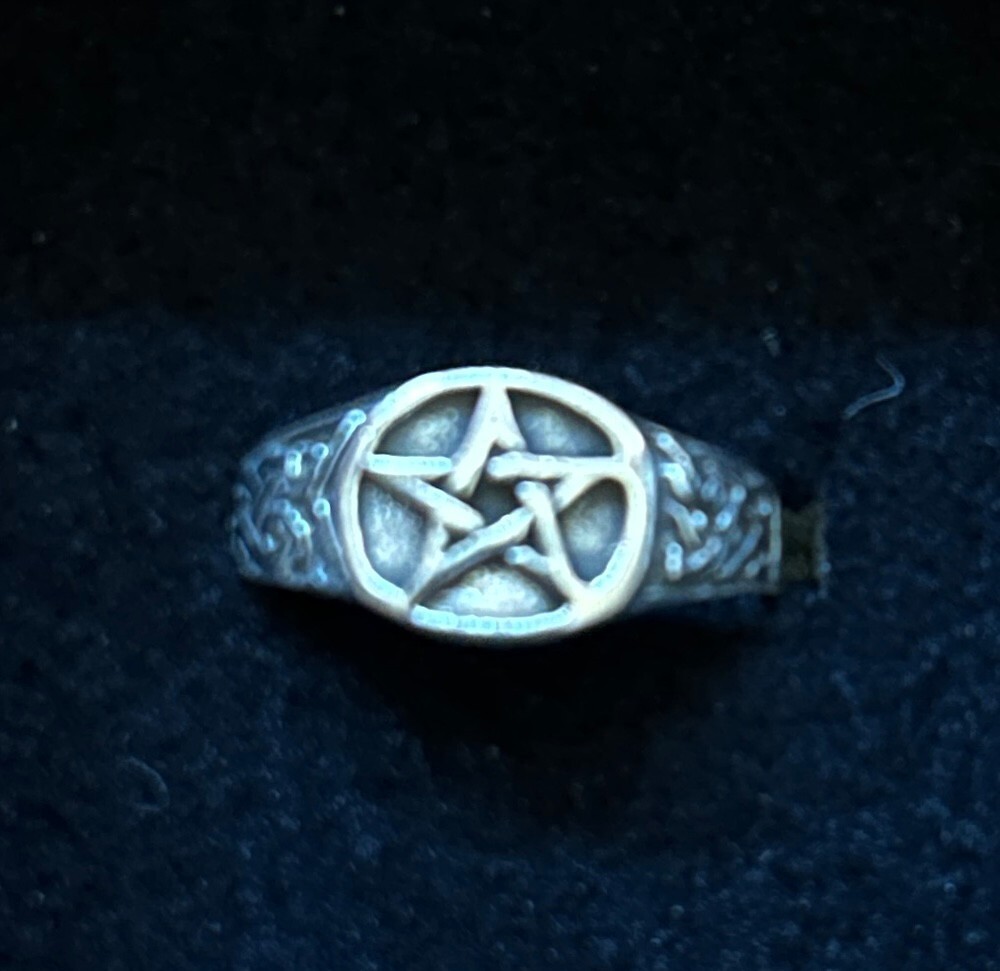 A simple pentagram ring in pewter. Size per manufacturer 7-8.