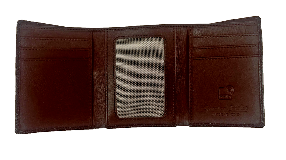 Skinoutfit Tri-Fold Leather Wallet New in Box Black Leather/Herringbone print design. Made in India Has RFID blocking for card safety and protection GENUINE LEATHER ? Made of the top first layer of cowhide leather. With nice and smooth texture, really soft comfortable to touch and ultralight. MINIMALIST PRACTICAL DESIGN ? 6 card slots, 2 hidden slots, 1 cash pockets. It can hold a TOTAL of 6 cards. Classify money cards, easy to put in and take out. SPECIAL PROCESSING ? The fabric is fully waxed (oil wax leather), highlights the texture of the cowhide, and processing molded in water. More than 33 processing step makes it wears resistant, more reliable and without deformation. APPLICABLE PEOPLE ? The wallet is suitable for men of all ages, whether it's business or leisure, can demonstrating the charm of any occasions. Plus, with the gift box packaging, it will be the perfect choice for your gift giving. PERFECT GIFT IDEA FOR ALL OCCASIONS - This beautiful and elegant slim wallet will make the perfect gift for every special gentleman in your life. Father's Day, Birthdays, Valentine's Day, Christmas, Graduation, Back To College or any Occasion which Calls for a gift.
