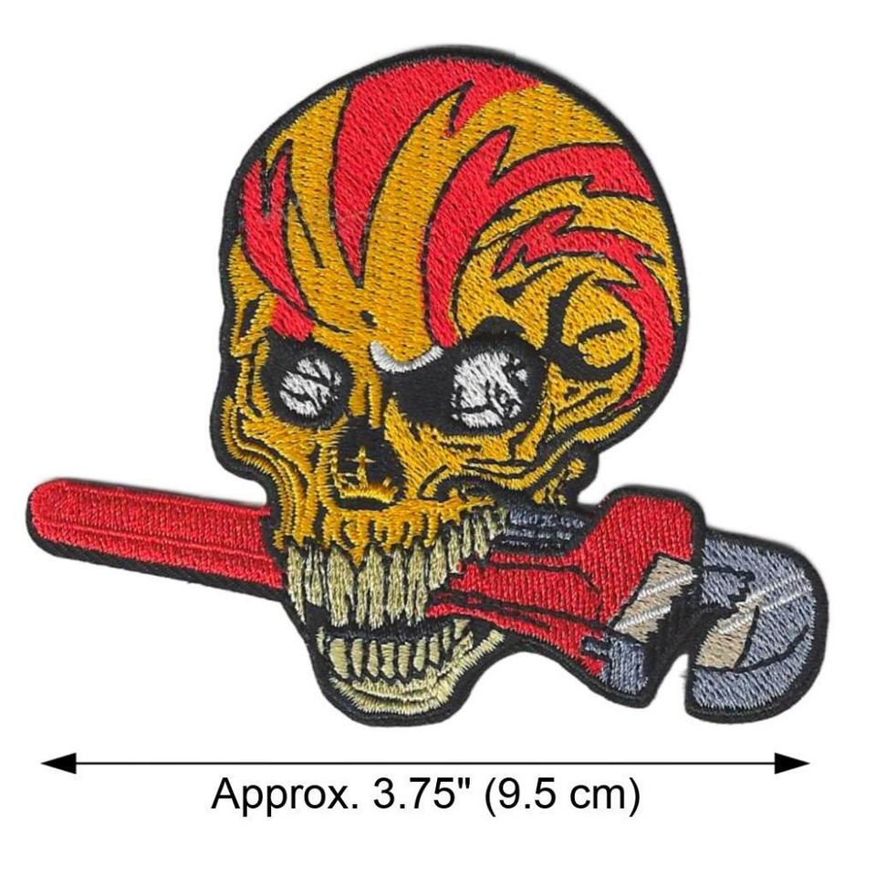 SKULL WITH WRENCH IRON ON PATCH 3.75" Punk Mechanic Biker Motorcycle Embroidered