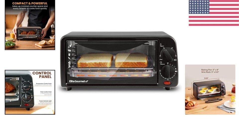 - Sleek Black 2 Slice Toaster Oven with Adjustable Timer & Non-Stick Accessories