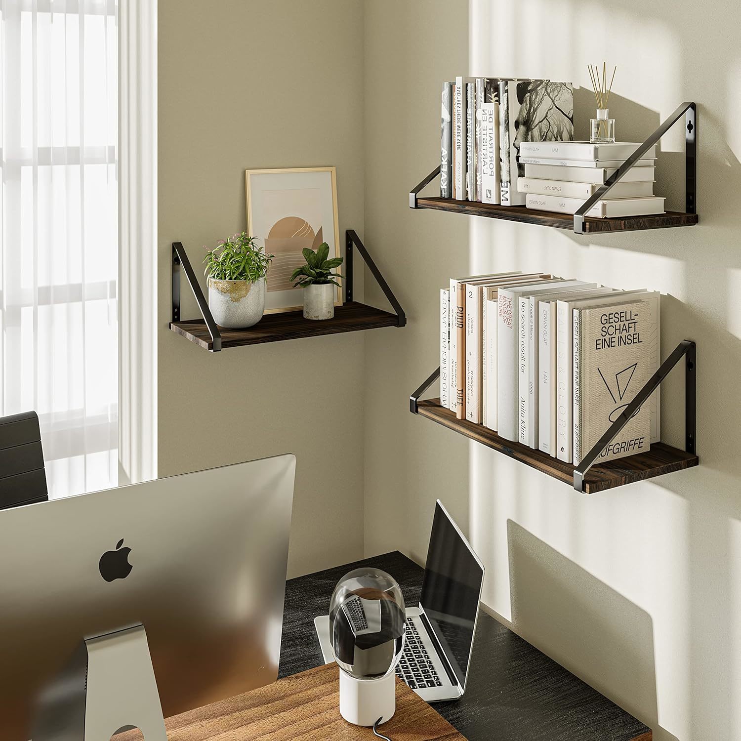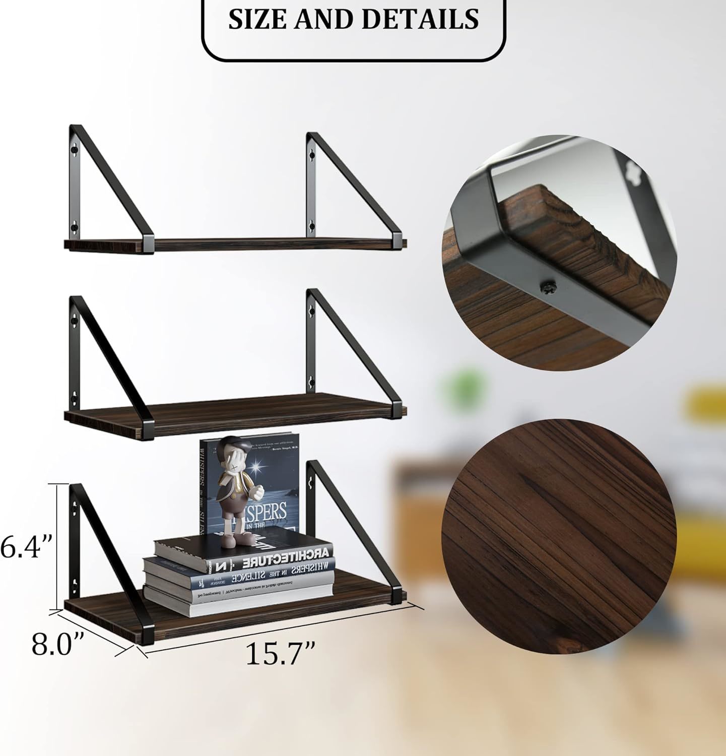 Wood ?Natural wood? BAMEOS's natural wood wall frame uses only high-quality wood, which is strong and light. Carbonized pine wood surface lacquer, so that the texture and color of each wood board are different, to meet your unique needs. May this wooden wall frame add beauty to your simple wall. ?Triangle bracket? Triangle is the most stable structure. BAMEOS's triangle bracket is made of high-quality steel, which is strong, stable,can provide good side support, so you can lean different objects on the stand. The surface of the bracket is painted, smooth and unflawed. We insist on using the simplest design to achieve 22LBS load-bearing capacity. ?Two types of assembly?Customize the installation by creating your own style. The unique design provides two different display forms. The brackets can be installed above or below the board. The two installation methods can be freely matched to achieve diversified decoration and meet your respective needs for decoration in various rooms. ?Multifunctional and multi-scene? You can not only use these hanging shelves as decorative shelf units or towel racks in the bathroom but also as spice rack shelves, CD, and DVD shelves in the kitchen to create exquisite storage and display. Because the size is15.7*8inch, it is also a good choice as a bookshelf. ?Great gift idea? This versatile floating wooden shelf is very suitable for various rooms such as bathrooms, kitchen, living room, game room, etc. Therefore, it will be a perfect gift idea for birthdays or other occasions. Everyone, especially book lovers, collectors, and people who like antique wooden wall decorations will like this gift.
