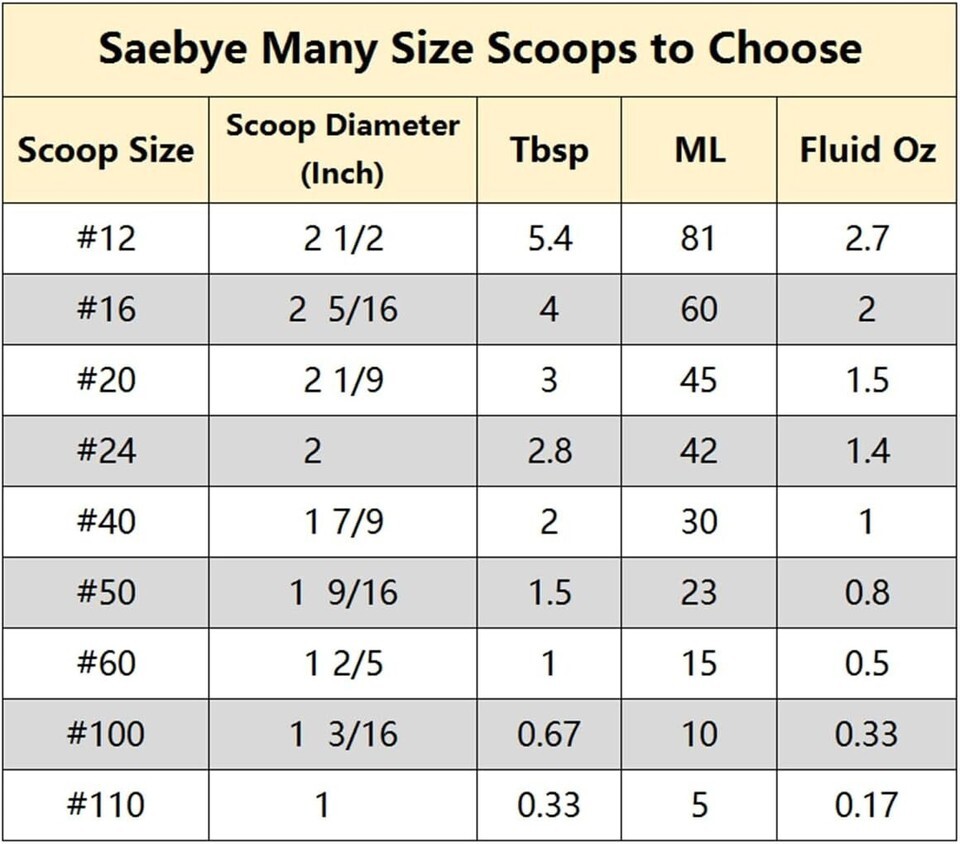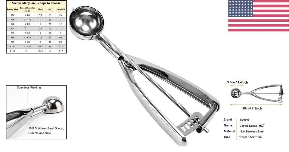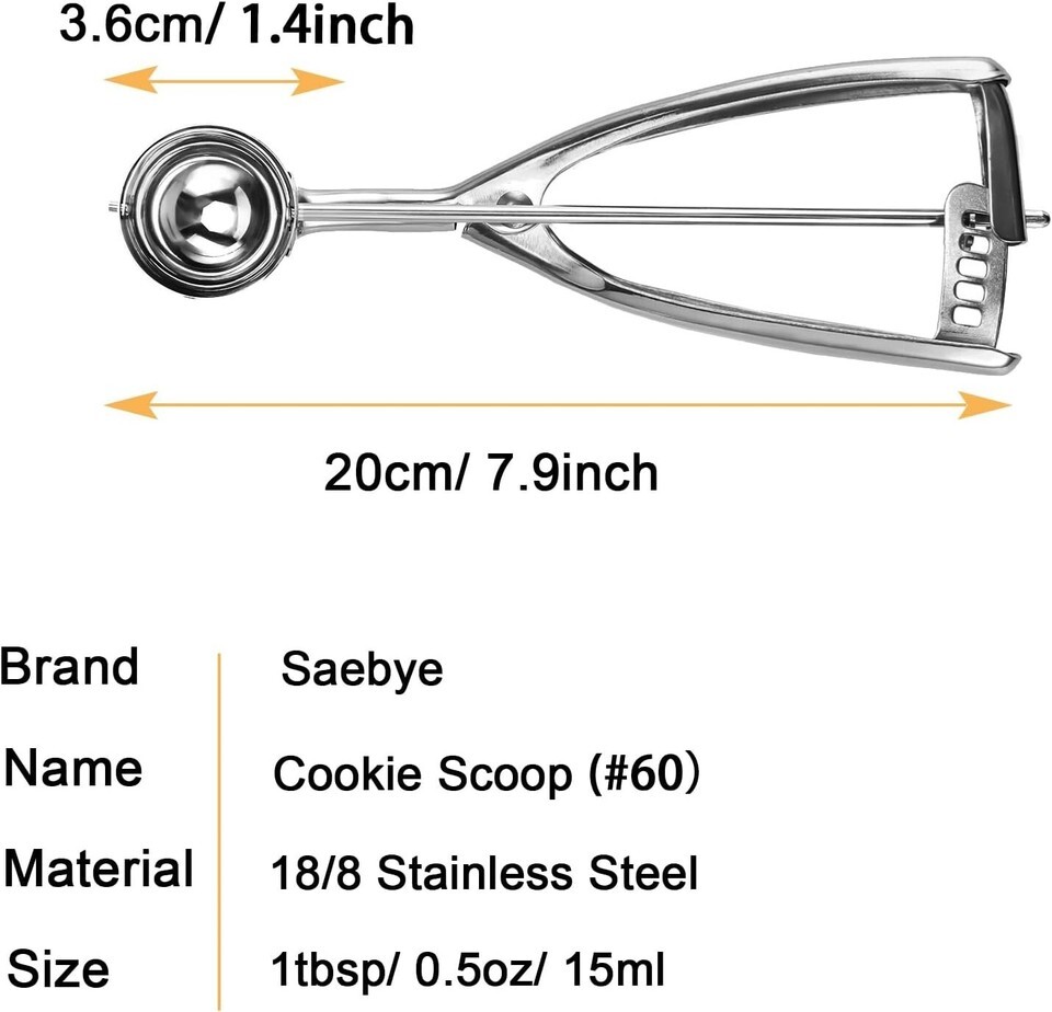 Perfect Size: The small cookie scoop (#60 size) has a diameter of 1 13/32 inches (36 mm) with a capacity of 1 tablespoon (15 ml / 0.5 oz).