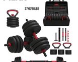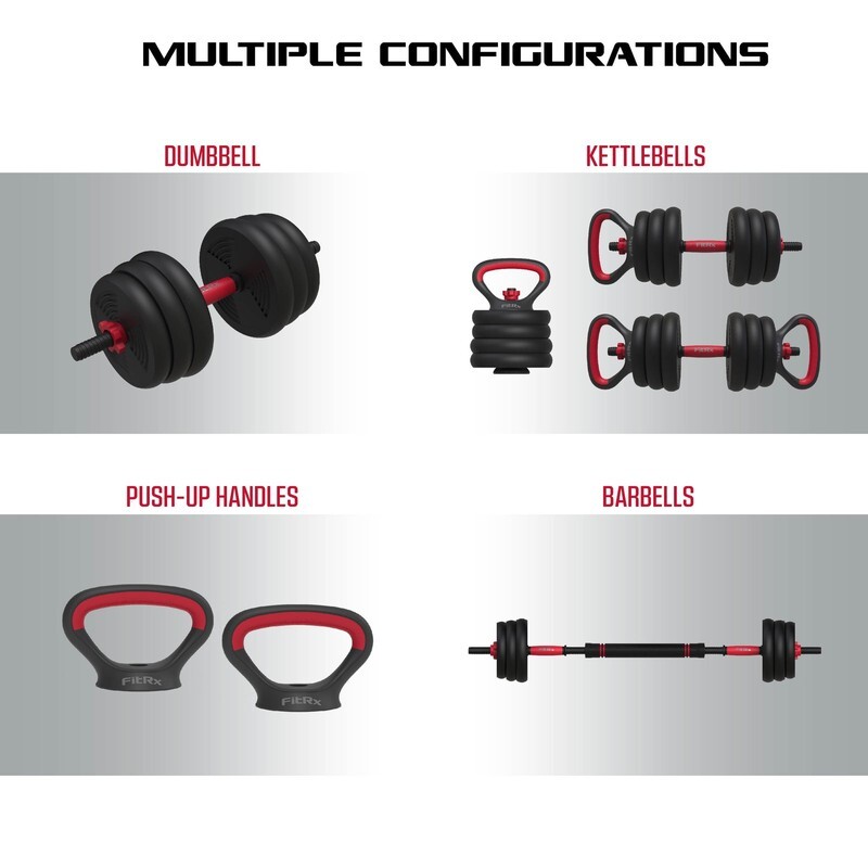 4-in-1 interchangeable free weights system can be used as a barbell, kettlebell, two dumbbells, or push-up handles Comfortable textured dumbbell grip 23-piece set: includes four 4lb plates, four 5lb plates, four 6lb plates, one barbell rod, two dumbbell bars, one kettlebell base, two push-up handles, and five screw nuts Slip-resistant push-up handles Padded barbell connector Adjustable weight configurations for each piece of equipment Versatile and space-conscious design Various weights totaling 60lbs