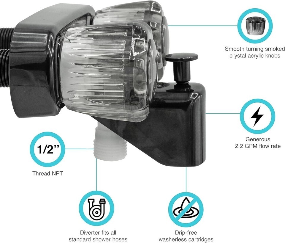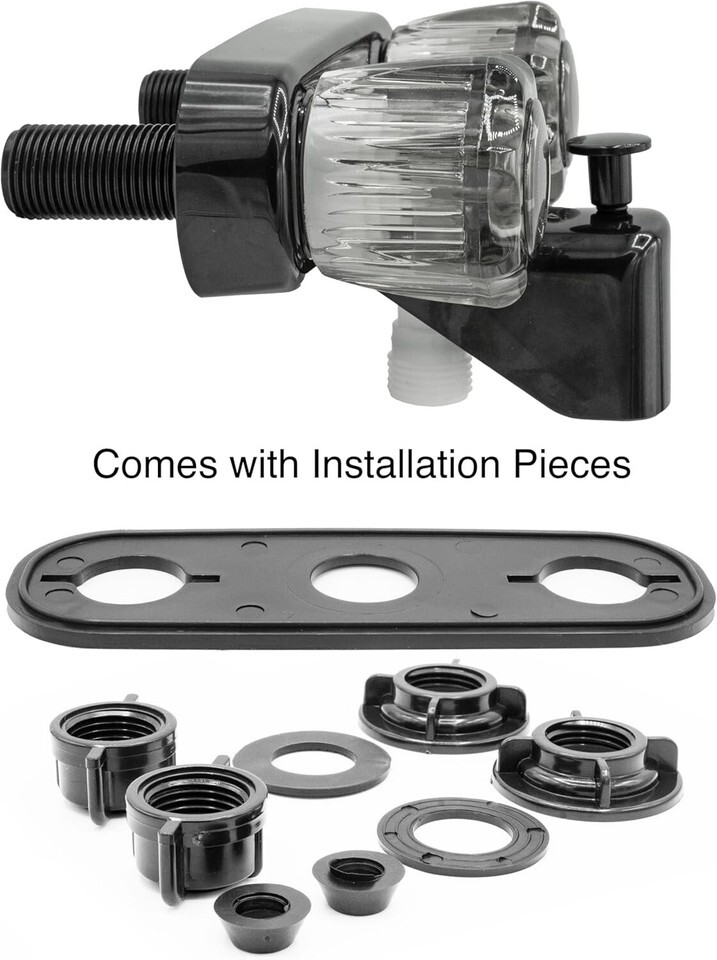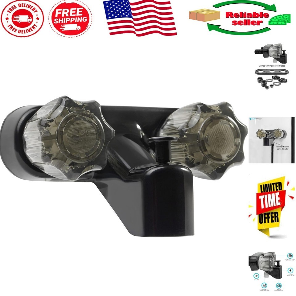 Smooth-Operating Black Diverter Faucet for RVs - Easy Install with Acrylic Knobs ? ? ? ? ? ? ? ? ? ? ? ? ? ? ? ? ? ? ? ? ? ? Smooth-Operating Black Diverter Faucet Perfect for RVs ? Easy Install with Stylish Acrylic Knobs Features: Classic exterior with a fully functional diverter for seamless water flow adjustment. Smoked crystal acrylic knobs allow for quick temperatures and aerated water pressure adjustments. grade lightweight synthetic waterways ensure longevity and durability. Sturdy plastic construction designed to withstand daily use in a recreational vehicle. Design: Classic arc spout perfectly complements your existing shower hardware. Engineered to fit seamlessly in the compact space of RV showers. Quality: Durable design with easy-to-turn knobs offers a smooth operating action. Helps prevent unwanted dripping, ensuring efficient water usage. Diverter fits all standard shower hoses, making it an effortless upgrade. Installation: No plumbing expertise needed; designed for easy installation. Suitable for installation in any 2-hole 4? opening with a powerful flow rate of 4 GPM. 1/2" thread, UPC and CUPC Certified for your peace of mind. Why Choose Our Diverter Faucet? Transform your RV shower experience with our Smooth-Operating Black Diverter Faucet. This elegant and functional piece perfectly marries style with convenience, designed specifically with the unique needs of recreational vehicle living in mind. By choosing this faucet, you ensure a reliable, efficient, and aesthetically pleasing addition to your RV's shower hardware. Plus, with USA-based customer support, you have the assurance that any questions or concerns will be addressed promptly and professionally. Elevate your RV experience today with our diverter faucet! Shipping Free Fast Shipping - We offer free shipping to most of the USA with a normal delivery time of 3-7 days. However, due to the current situation, additional delivery time (up to 3 weeks) may be required for some items. Alternative Carriers - We may use alternative carriers (e.g. USPS, FedEx, UPS, etc.) to ensure your package arrives safely and on time. Due to the use of multiple carriers, we are unable to provide a tracking number automatically. Handling Time - Orders are processed and shipped within 1-2 business days of receiving cleared payment. Shipping Restrictions - Shipping to Alaska, Hawaii, Puerto Rico, Guam, and other US territories may incur shipping charges or delivery restrictions. Please contact us before ordering, or your order can be refunded/cancelled. State Restrictions - There may be restrictions based on your state of purchase. For example, certain items may not be shipped to California due to state regulations. Contact for Tracking Updates - If you require tracking updates or have any concerns about the delivery of your order, please feel free to contact us, and we will be happy to assist you. Return 30-Day Hassle-Free Returns - We want you to be completely satisfied with your purchase. If you are not, you can return the item within 30 days of receiving it for a full refund or exchange. Easy Return Process - To start a return, simply contact us and we will provide you with a prepaid return shipping label and detailed instructions. Restocking Fee - There are no restocking fees for returns. However, the buyer is responsible for return shipping costs if the return is not due to a seller's error. Refund Processing Time - Refunds will be processed within 5 business days of receiving the returned item in its condition. Payment We accept all major credit cards, PayPal, and Apple Pay for your convenience. Your payment information is secure and encrypted to ensure a safe and seamless transaction. Please complete your payment within 3 days of purchase to avoid any delays in shipping. Feedback Your feedback is extremely important to us. We strive to provide the best products and customer service possible. If you are satisfied with your purchase, please take a moment to leave us a positive review. If you have any concerns or issues with your order, please contact us before leaving negative feedback. We are committed to resolving any problems and ensuring your satisfaction. Contact Us If you have any questions or concerns, please feel free to out to our customer support team. You can contact us through the messaging system. We are available Monday to Friday, 9:00 am to 5:00 pm EST, and we will do our best to respond to your inquiry within 24 hours. Buy it now and enjoy a pleasant shopping experience! Item Weight: 15.5 ounces Flow Rate: 4 GPM Unit Quantity: 1 Suitable For: Shower,outdoor,bathroom Material: Plastic,Synthetic Waterways,Acrylic Features: Easy to Install,Lead Free,Tarnish Resistant Room: Bathroom Items Included: Instruction Manual,Diverter Type: Diverter Faucet Color: Black Number of Faucet Handles: 2 Number of Faucet Holes: 2 Finish: Polished Handle Type: Knob Installation: Wall Mounted Faucet Hole Spacing: 4 in Faucet Mounting Type: Centerset Minimum Pressure: 60 pound per square inch Style: Classic Unit Type: oz