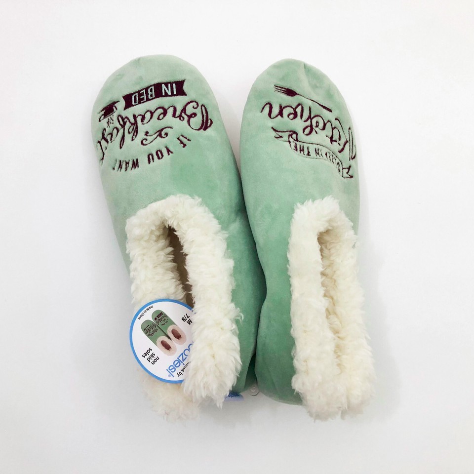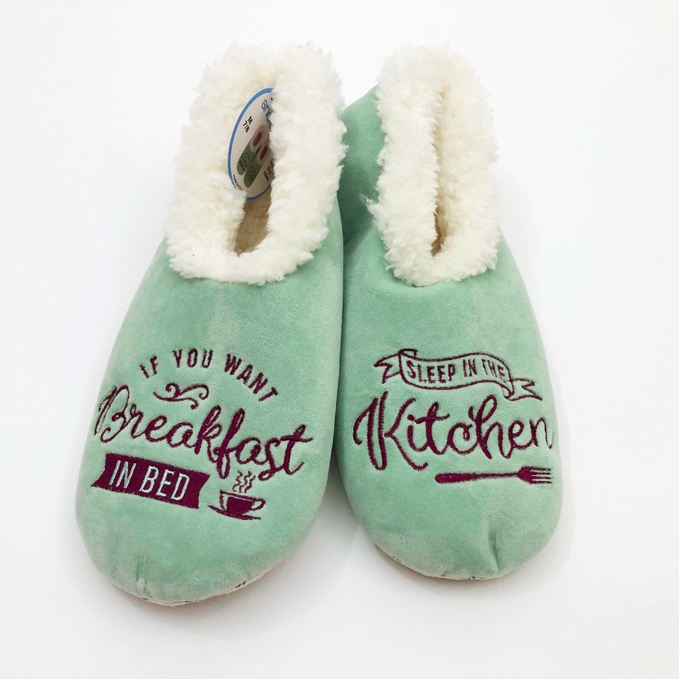 NWT, New With Tags, Sales Samples. Cute slippers for those who like breakfast in bed. One slipper says" If you want Breakfast in Bed" with a steam cup of coffee next to the saying, and the other slipper says "Sleep in the Kitchen" with an embroidered fork below it. Cute, fun way of saying who is really in charge. Makes a great gift. Fun slippers with non-skid soles. Brand Snoozies Cozy little foot coverings Made in China US size women's Medium 7/8 Light mint color green with white faux fur lining Faux fur lining Lining/sole 100% polyester Machine wash inside out, gentle cold water tumble dry. SKU UU-2-01-24-029