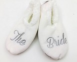 NWT, New With Tags, Sales Samples. Comfortable , soft, with non skid soles. Now the bride can relax with her own pair of soft and warm Snoozies slippers. White with white Sherpa (faux fur) lining and non skid soles One slipper has "The" embroidered in silver and the other slipper has "Bride" embroidered in silver. Perfect for the bride to be when she is relaxing. White with white Sherpa Faux fur lining Fun slippers with non-skid soles. Brand Snoozies Cozy little foot coverings Made in China US size women's Medium 7/8 Multi colored Faux fur lining Lining/sole 100% polyester Machine wash inside out, gentle cold water tumble dry. SKU QQ-2-10-23-002