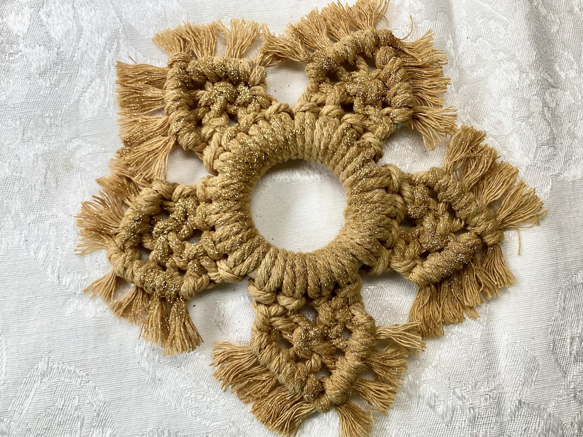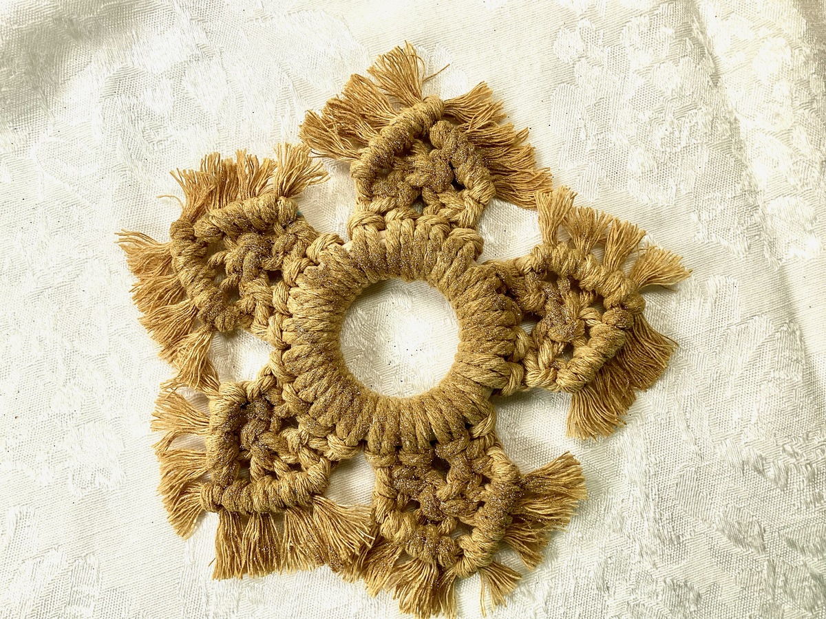 This handmade macrame Christmas snowflake measures just under 6" across. It is made from antique gold cord with gold glitter for sparkle. In the USA shipping is free.