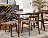Features: Constructed from rubberwood, MDF wood, and LVL Walnut brown finish Walnut brown finish Upholstered in polyester fabric and padded with foam Rectangular tabletop Splayed legs Set Includes: One (1) Dining Table; Four (4) Dining Chairs