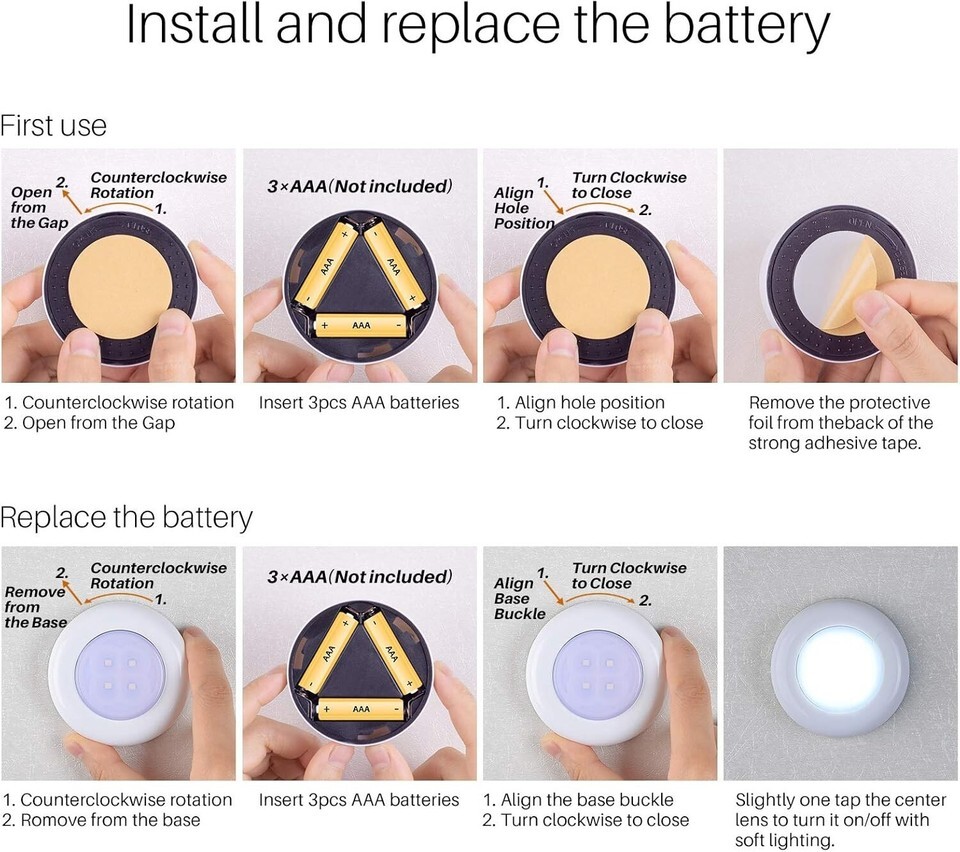 Battery Operated: Each puck light operates on 3 AAA batteries (not included), providing a wireless and hassle-free solution with no fear of electric shock for children.