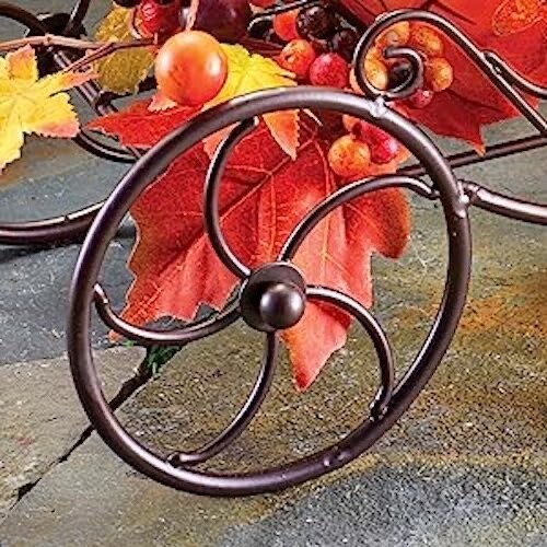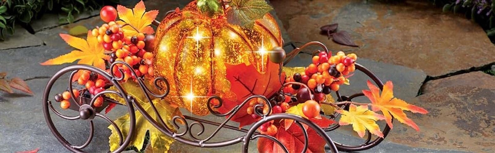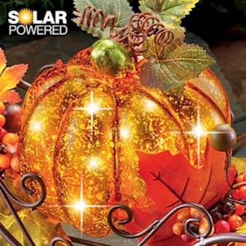 This solar-powered pumpkin sits atop a decorative iron coach and is surrounded by lovely fall accents including berries and colorful leaves. The faux mercury glass pumpkin automatically shines with warm light at night.