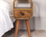 This ultra-compact bedside table is a versatile addition to any space, perfect as a spot for snacks, drinks, or a small lamp. Crafted from 100% solid mango wood with a oak-ish finish, it features softly curved edges, one convenient drawer, an open storage slot, and four Nordic-style legs. Part of our Recession Collection, this stylish piece offers functionality and charm for smaller spaces.