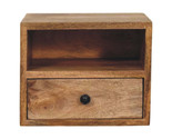 Redefine your bedroom aesthetic with the Solis 1-Drawer Wall Mounted Nightstand, a standout piece from the Solis Collection. Designed to maximize functionality while saving space, this wall-mounted nightstand features an elegant Oak-ish finish that highlights the natural beauty of mango wood. Its open slot offers easy access to essentials or decorative pieces, while the single drawer provides discreet storage for a clutter-free look with sleek black metal knob .