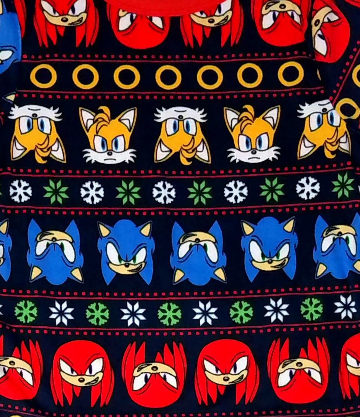 The pajama top features a fun and colorful Sonic, Tails, and Knuckles fair isle-themed print. Its vibrant red rib-knit collar adds to the festiveness.