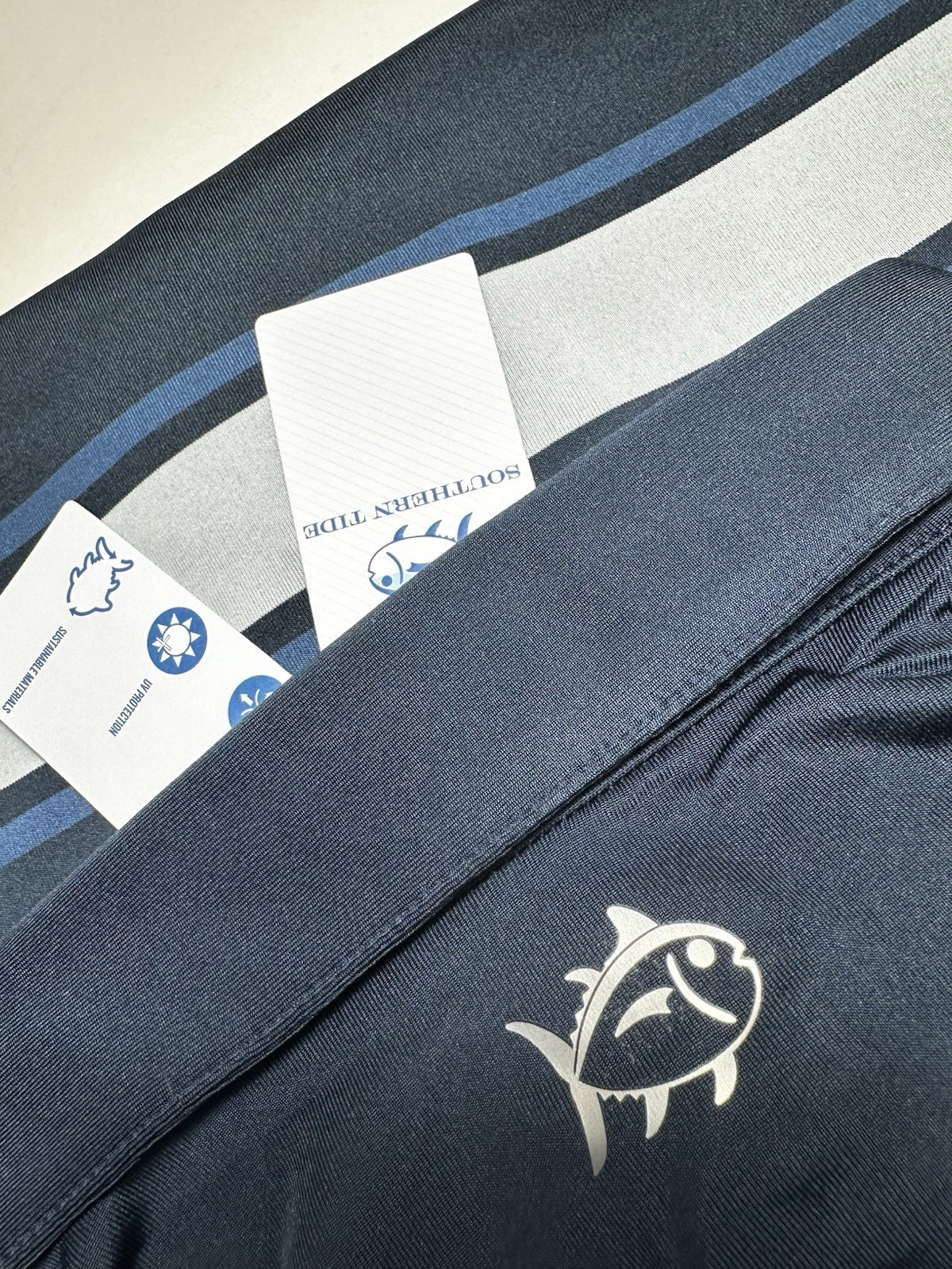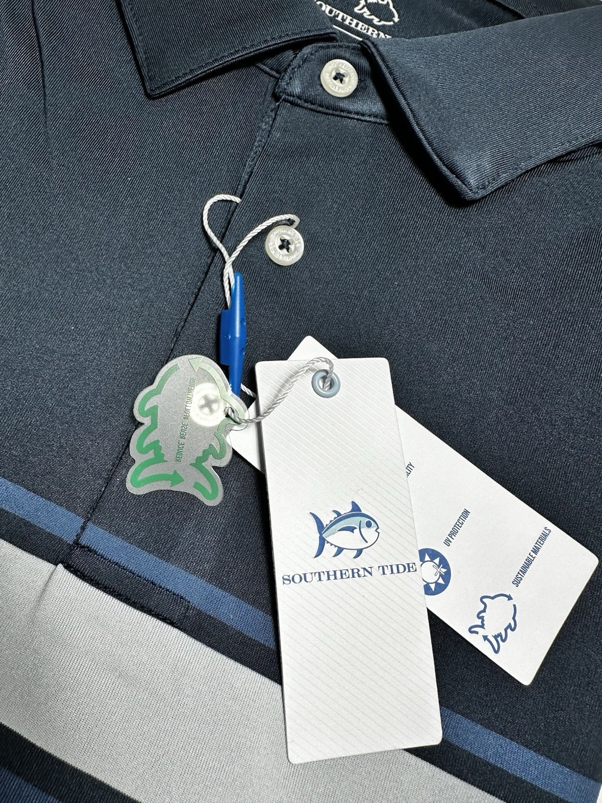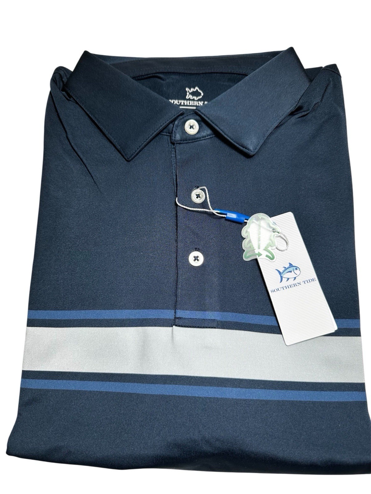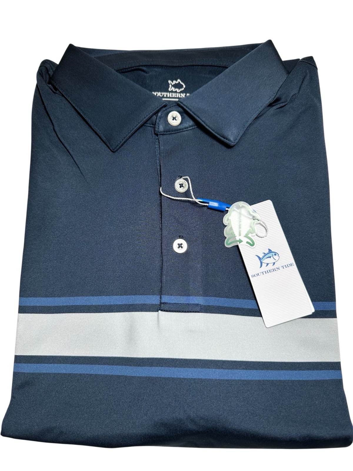 SOUTHERN TIDE men's short sleeve Driver Brenton striped Performance polo, UV Protection, Quick-Dry Fabric with Moisture Management. Original Price $95.New with Tags Style: # 10053 MSSCCCDrvrBrencnChstStrpPolo Fabric - 94% Recycled Polyester, 6% Spandex. Color - #1190 Navy Size - Medium Features thermal skipjack logo at the top back of shirt Measurements (All measurements laying down flat without stretching):Chest (Armpit to armpit): 22? Shoulder seam to shoulder seam: 20" Sleeve Length (From shoulder seam to the bottom of the cuff): 10 1/4" Length (From neck seam to the bottom of the shirt in the back panel): 31" Customer Service InformationThank you for your interest in my items! Should you need more information on this or any of the item I am selling, please let me know and I will answer you concerns as soon as possible. I will ship your item in a timely manner and will execute great care in the handling process. I will be happy to combine shipping on all purchases...
