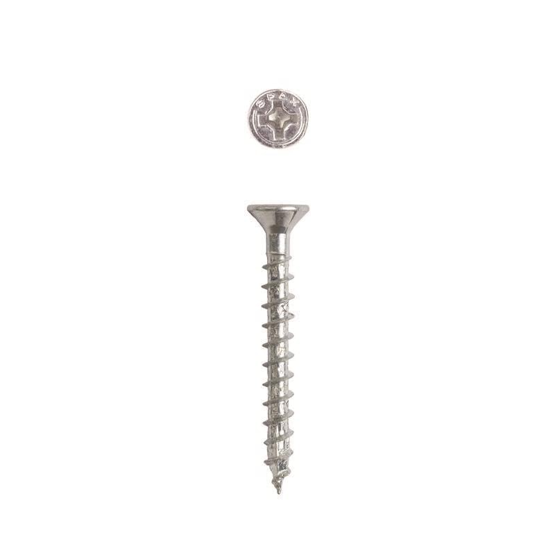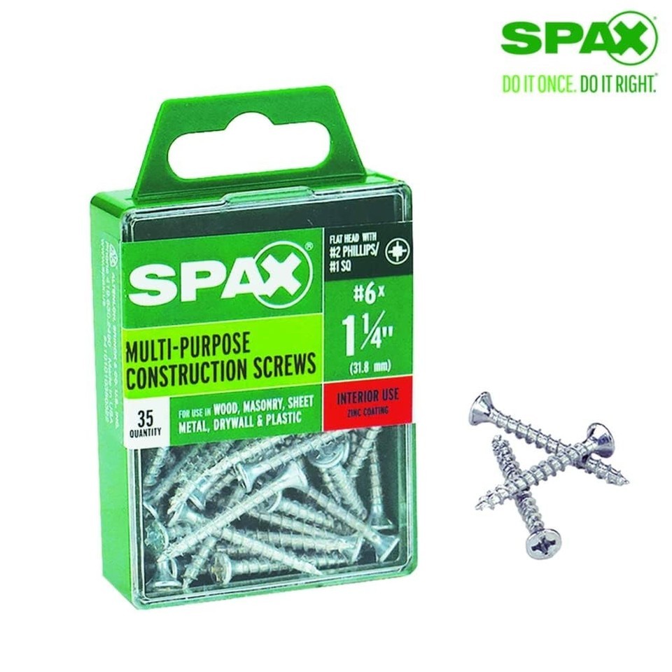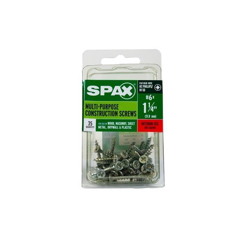 The SPAX factor - for the craftsman that concentrates on the details, we work for you. For the pro that puts qualify first, we help you create stronger connections, enhance performance and improve results when your reputation is on the line. This high performance wood screw is not your average screw. While it is designed for wood applications it is also functional for other materials like masonry, drywall, plastic and up to 24ga steel. Masonry and concrete do require pre-drilling. It is made with carbon steel and coated for durability to fasten strongly and securely. U.S made SPAX is your trusted partner for your fastening needs. Do it Once, Do it Right with SPAX.; ; Brand Name: SPAX Sub Brand: Multi-Material Callout Size: No. 6 Label Length: 1-1/4 in. Drive Style: Unidrive Head Type: Flat Head Product Type: Construction Screws Number in Package: 35 pk Driver Bit Included: No Color: Silver Indoor or Outdoor: Indoor Diameter: No. in. Self Drilling: No Grade: 5 Grade Finish: Zinc-Plated Packaging Type: Boxed Thread Type: Serrated Application: Multi-Purpose Material: Steel Self Tapping: Yes