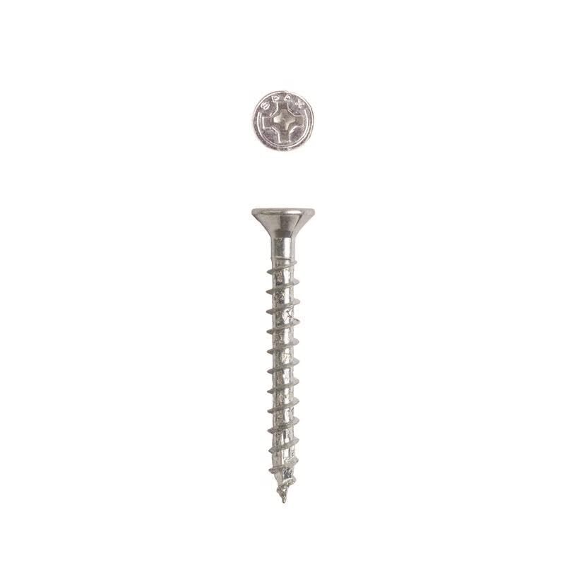 Product description: The SPAX factor - for the craftsman that concentrates on the details, we work for you. For the pro that puts qualify first, we help you create stronger connections, enhance performance and improve results when your reputation is on the line. This high performance wood screw is not your average screw. While it is designed for wood applications it is also functional for other materials like masonry, drywall, plastic and up to 24ga steel. Masonry and concrete do require pre-drilling. It is made with carbon steel and coated for durability to fasten strongly and securely. U.S made SPAX is your trusted partner for your fastening needs. Do it Once, Do it Right with SPAX.; ; Brand Name: SPAX Sub Brand: Multi-Material Callout Size: No. 6 Label Length: 1-1/4 in. Drive Style: Unidrive Head Type: Flat Head Product Type: Construction Screws Number in Package: 35 pk Driver Bit Included: No Color: Silver Indoor or Outdoor: Indoor Diameter: No. in. Self Drilling: No Grade: 5 Grade Finish: Zinc-Plated Packaging Type: Boxed Thread Type: Serrated Application: Multi-Purpose Material: Steel Self Tapping: Yes
