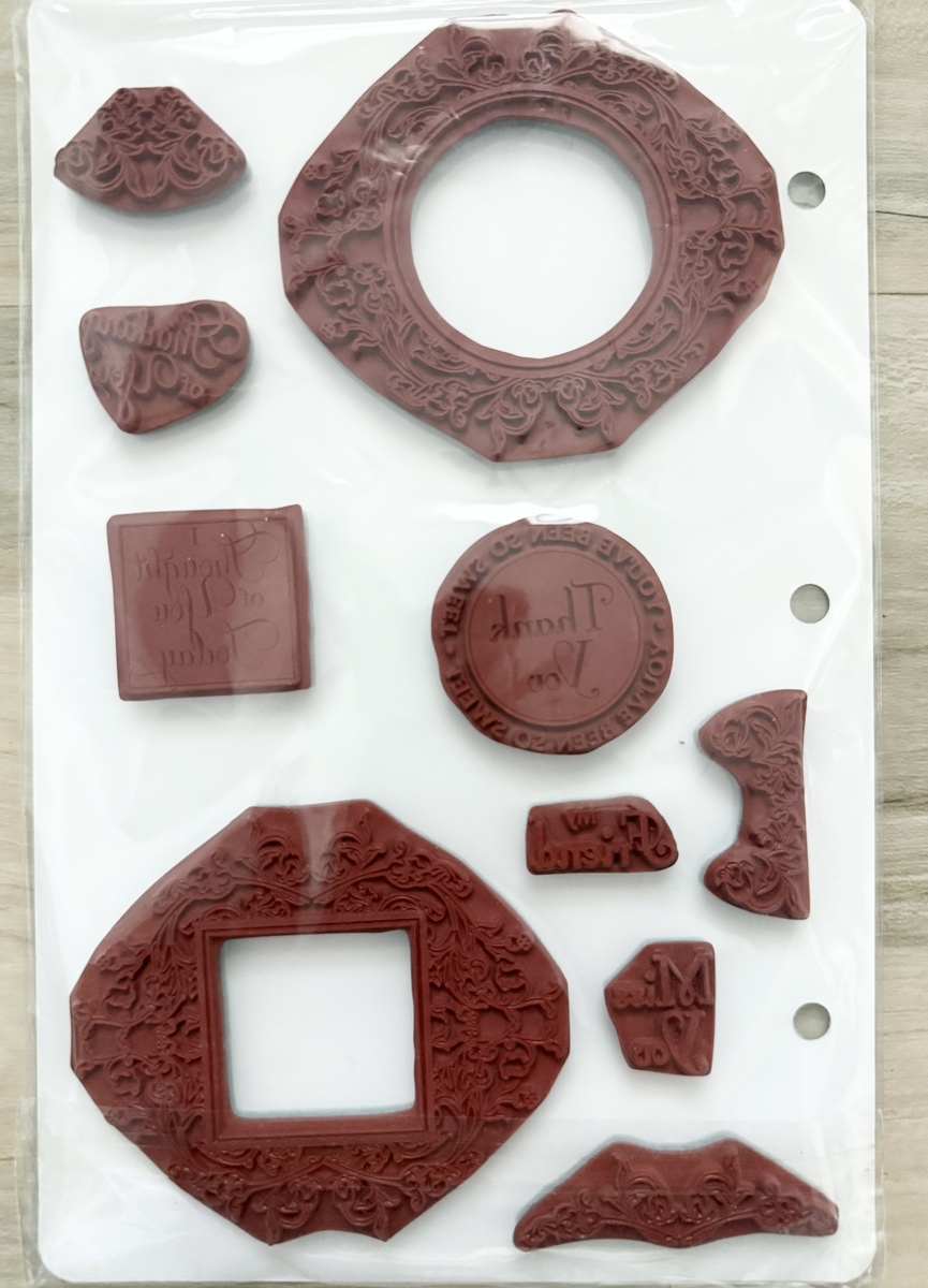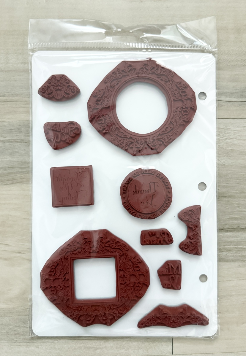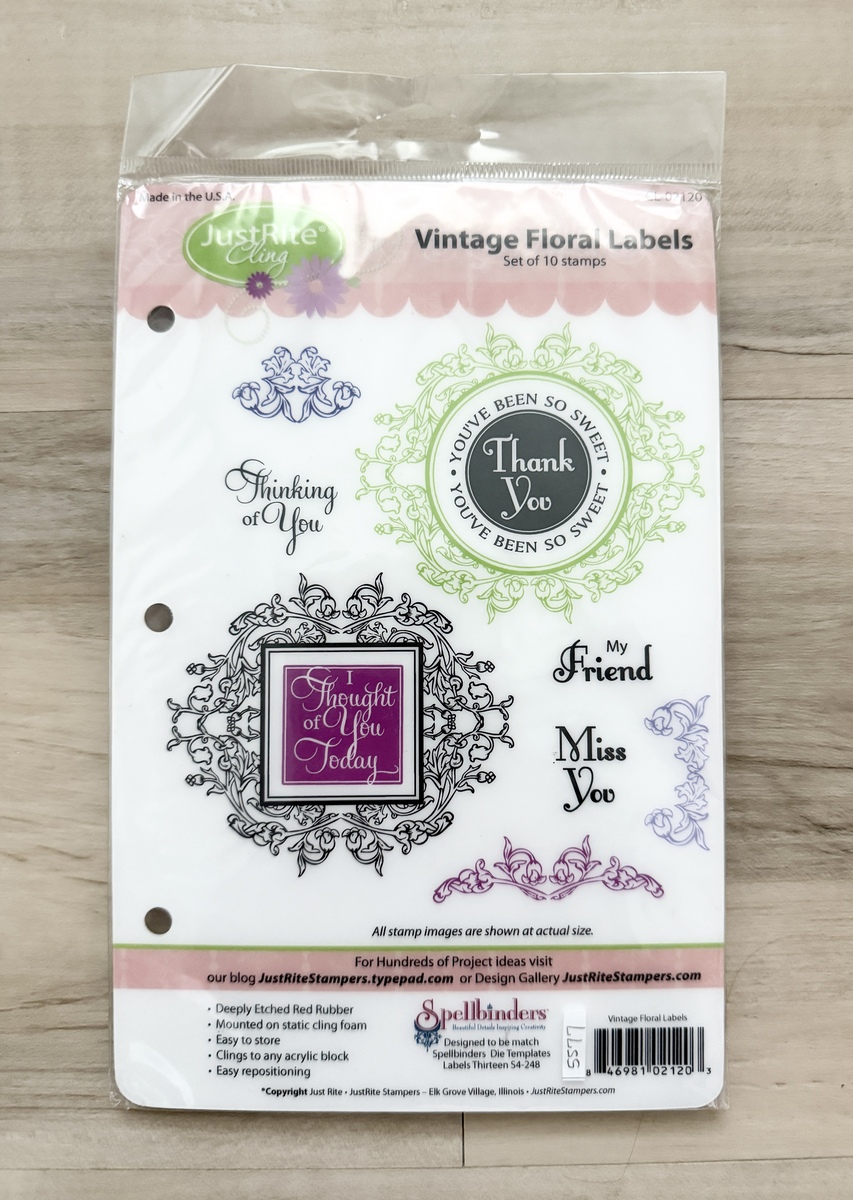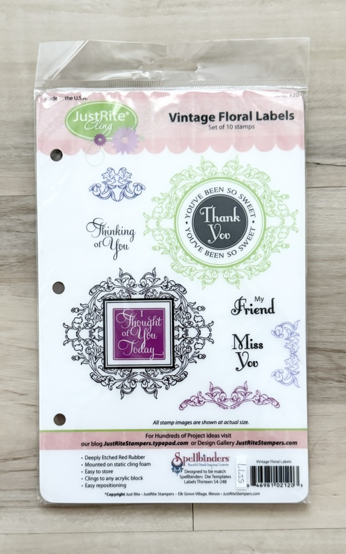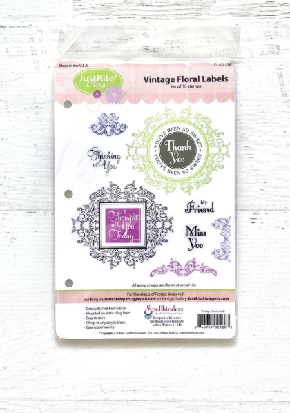 The Spellbinders Vintage Floral Labels stamp set brings both sentiments and frame stamps to create artful greeting on cards, albums, journals, and other paper crafting projects. These cling foam (EVA) rubber stamps are designed to be used with an acrylic block. This set includes 10 stamps with both frames and sentiments. This collection is a wonderful collaboration with JustRite Stampers. The largest stamp in this set is the circle frame which measures 3.25 X 2.5 inches in size. Note: although these stamps are gently used, they are in good working condition.