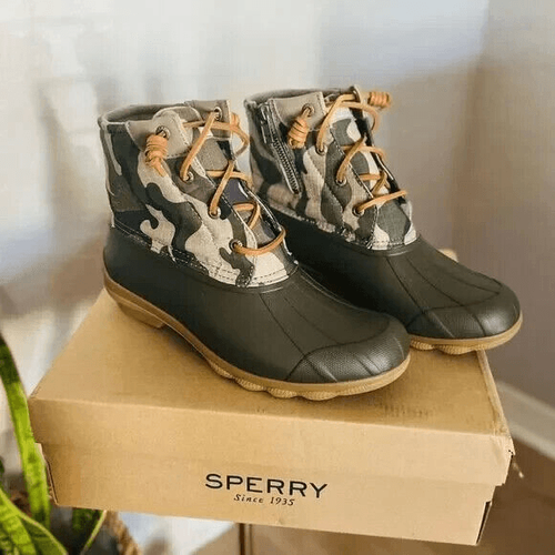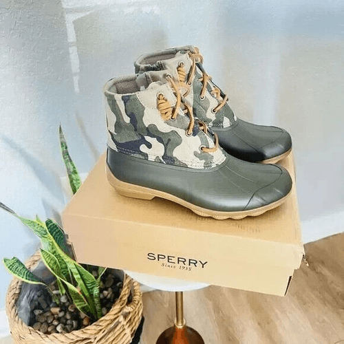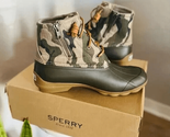 SPERRY TOP-SIDER Syren Gulf Camo Duck Toe Boot Color: Green Camo Size: 8.5 NEW WITH TAGS ATTACHED Edgy camo patterns this water-ready duck toe boot that's sure to offer comfort and style with every step. 5" shaft height Lace-up closure Cushioned insole Duck toe Textile and synthetic upper/textile lining/rubber sole Imported