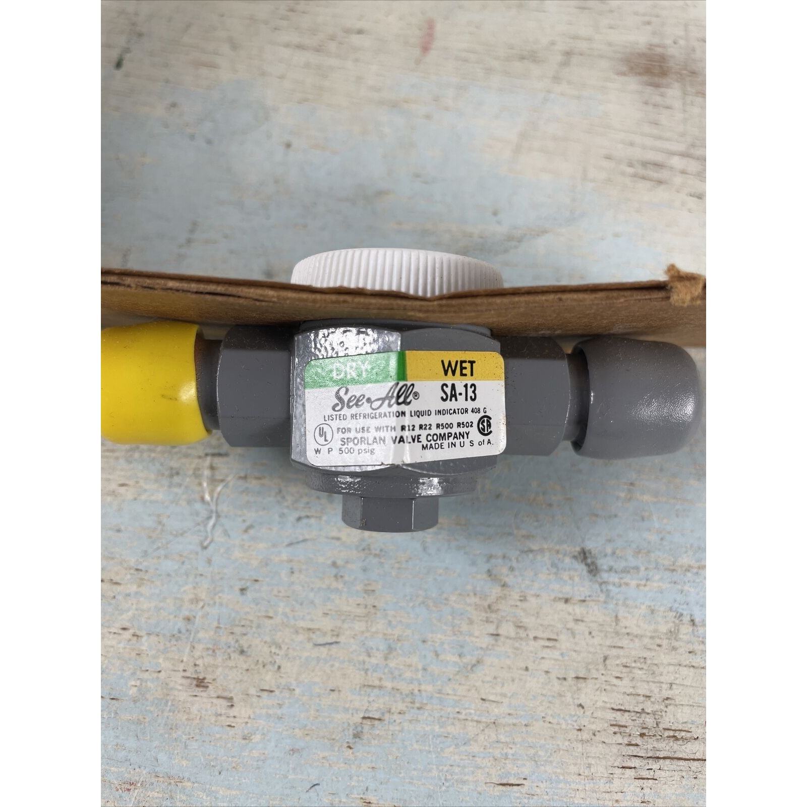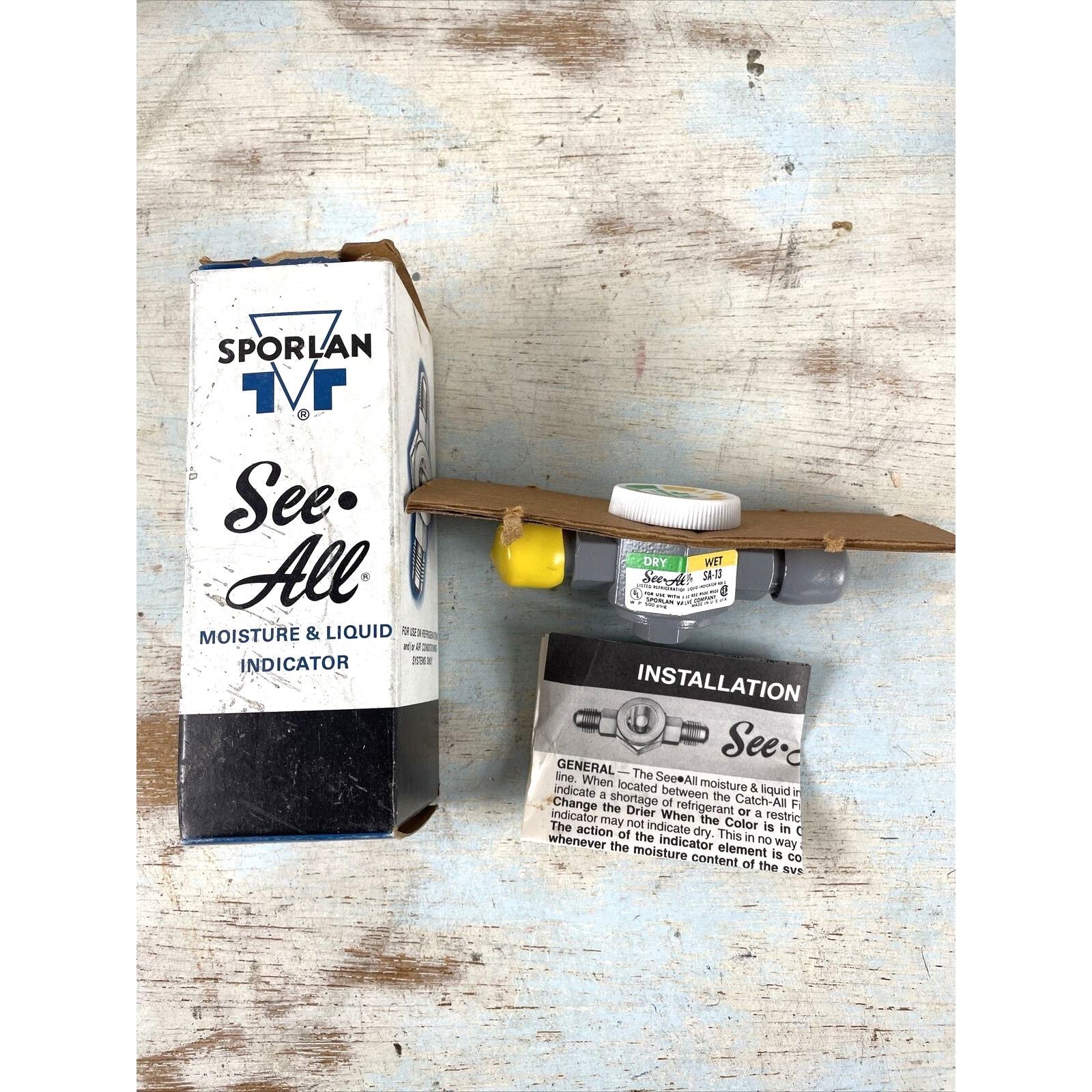 #1173. Sporlan SA-13 See all Moisture and Liquid Indicator 3/8" SAE New In Box. Please look at the pictures. Always consider offers. New old stock Sporlan SA-13 See-All Moisture and Liquid Indicator, 3/8? SAE connection, still sealed in original box. This indicator is used in refrigeration and air conditioning systems to monitor moisture content and refrigerant flow. Features include a clear glass viewing area, corrosion-resistant brass body, and a compact design for accurate system diagnostics. Perfect for HVAC professionals, contractors, or those restoring vintage systems.