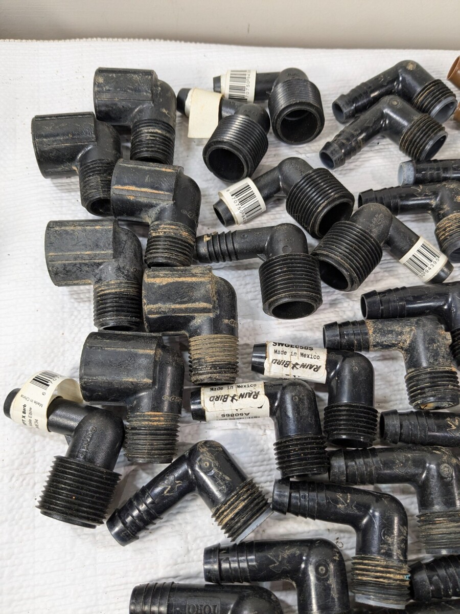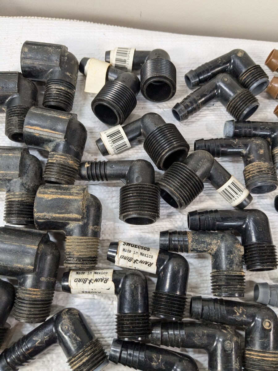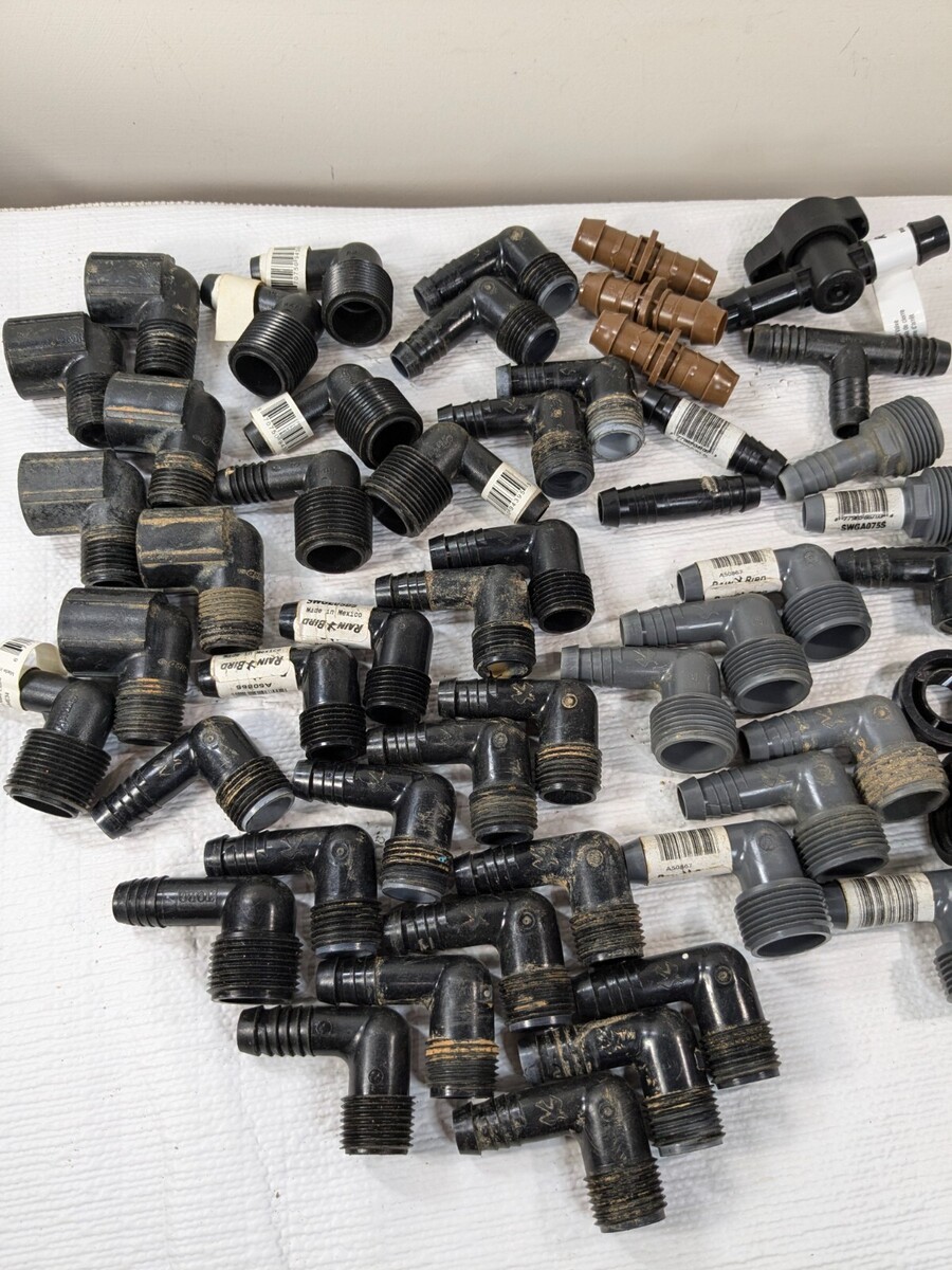 Sprinkler part set 50 RainBird Toro Orbit Apollo elbows Irrigation Tee Rain Bird Various sprinkler parts, most of them are used and have some dirt/debris as shown. Approximately 50 pieces total. Includes: Rain Bird Swge075s Rain Bird Swge050s Apollo Aime34 Toro Sprinkler Elbow Orbit Sprinkler Elbow Rain Bird Barbed Coupling Connectors Apollo Irrigation Tee Rain Bird Swgcplg Rain Bird Bval50-1