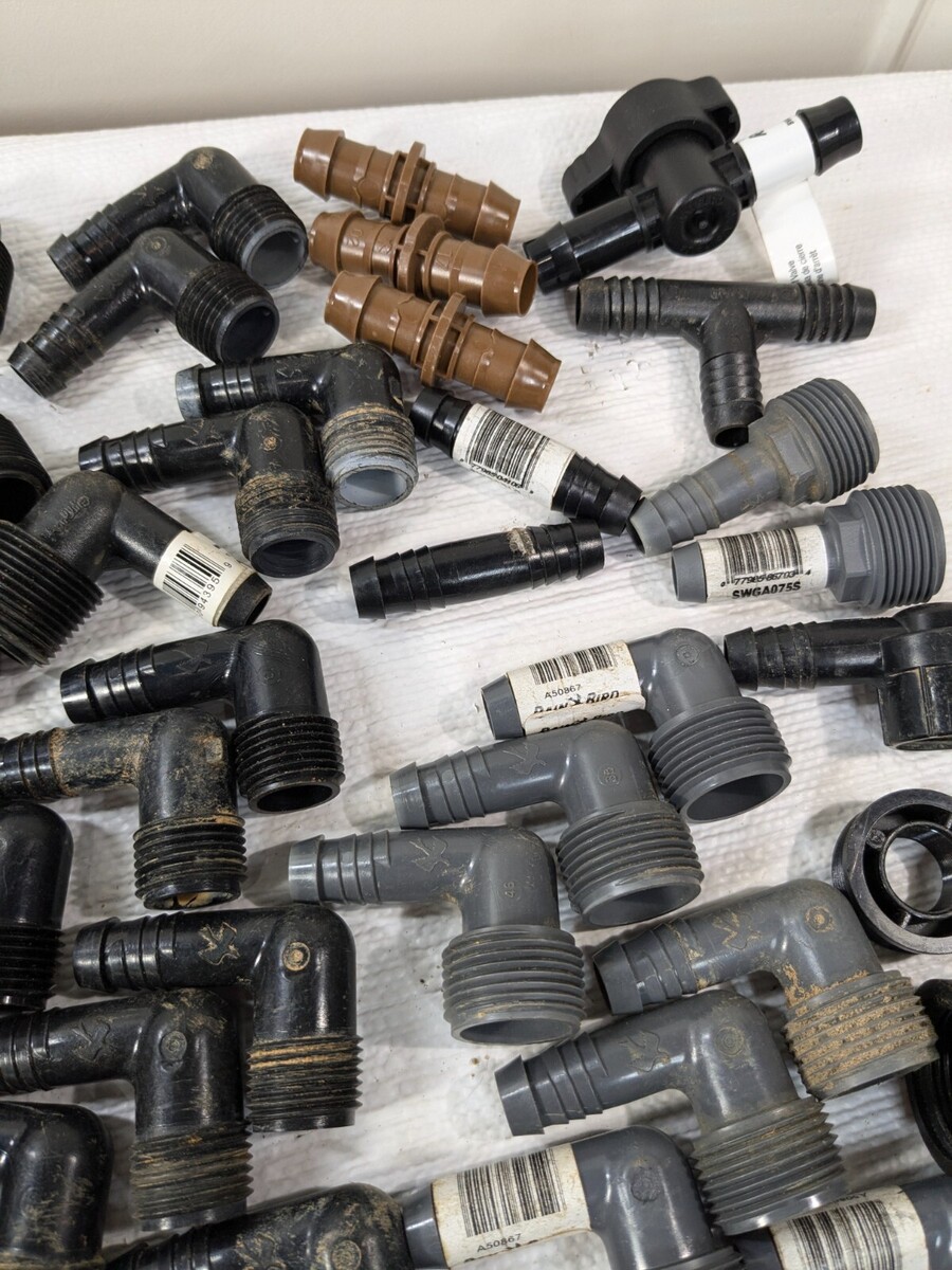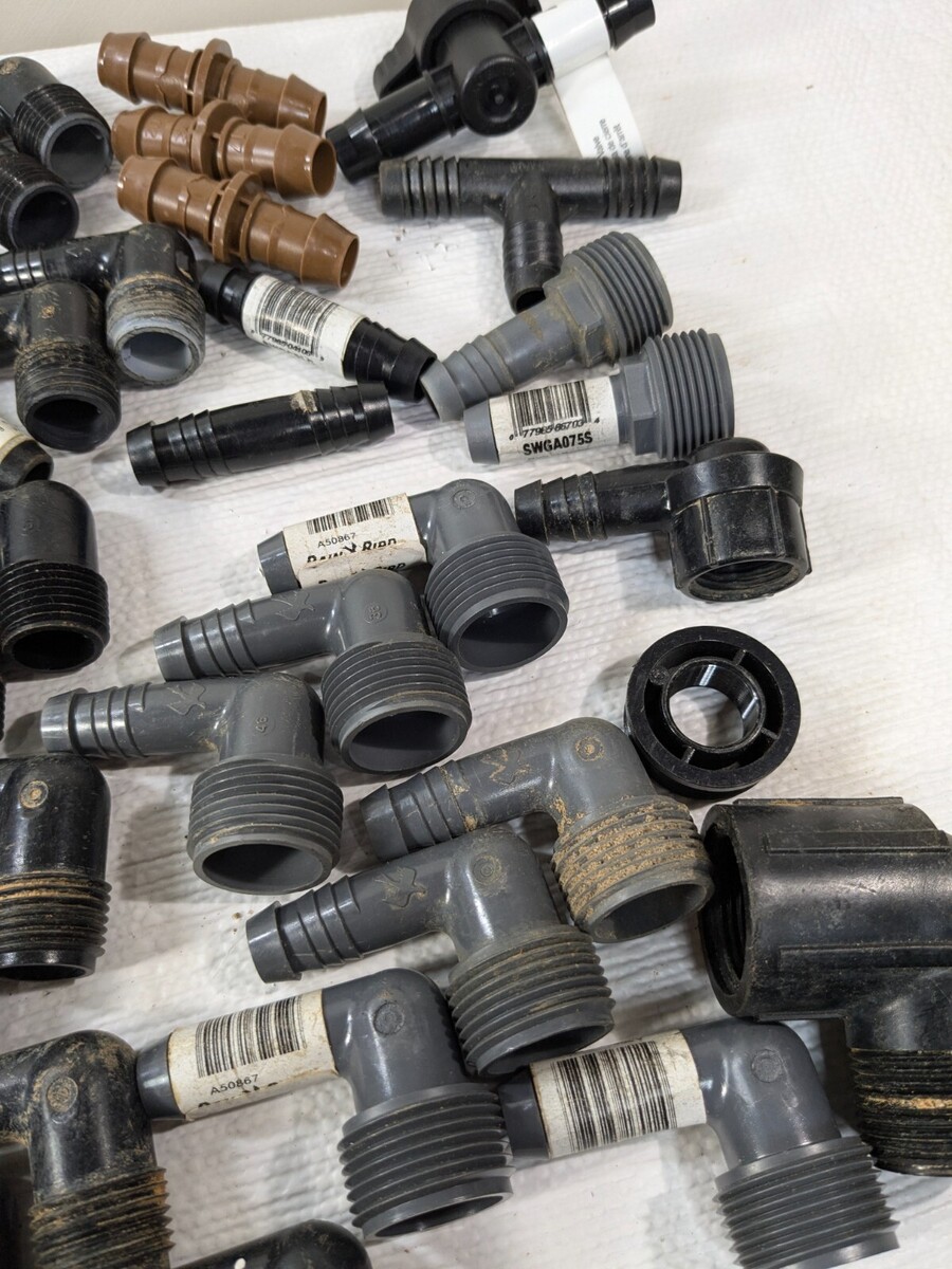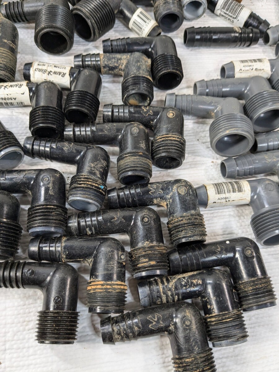Sprinkler part set 50 RainBird Toro Orbit Apollo elbows Irrigation Tee Rain Bird Various sprinkler parts, most of them are used and have some dirt/debris as shown. Approximately 50 pieces total. Includes: Rain Bird Swge075s Rain Bird Swge050s Apollo Aime34 Toro Sprinkler Elbow Orbit Sprinkler Elbow Rain Bird Barbed Coupling Connectors Apollo Irrigation Tee Rain Bird Swgcplg Rain Bird Bval50-1