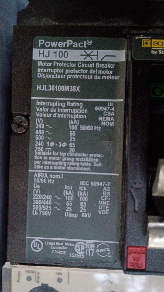 - Square D HJL36100M38X PowerPact Circuit Breaker 100 Amp 3 Pole 600VAC w Enclosur