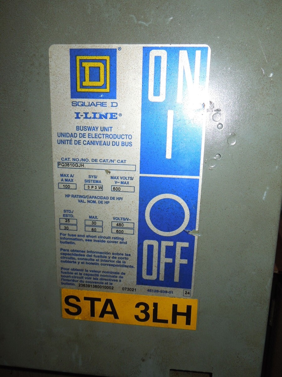 - Square D PQ3610GJH 100A 3ph 3W w/ Ground 600V Fusible I-Line Busway Switch