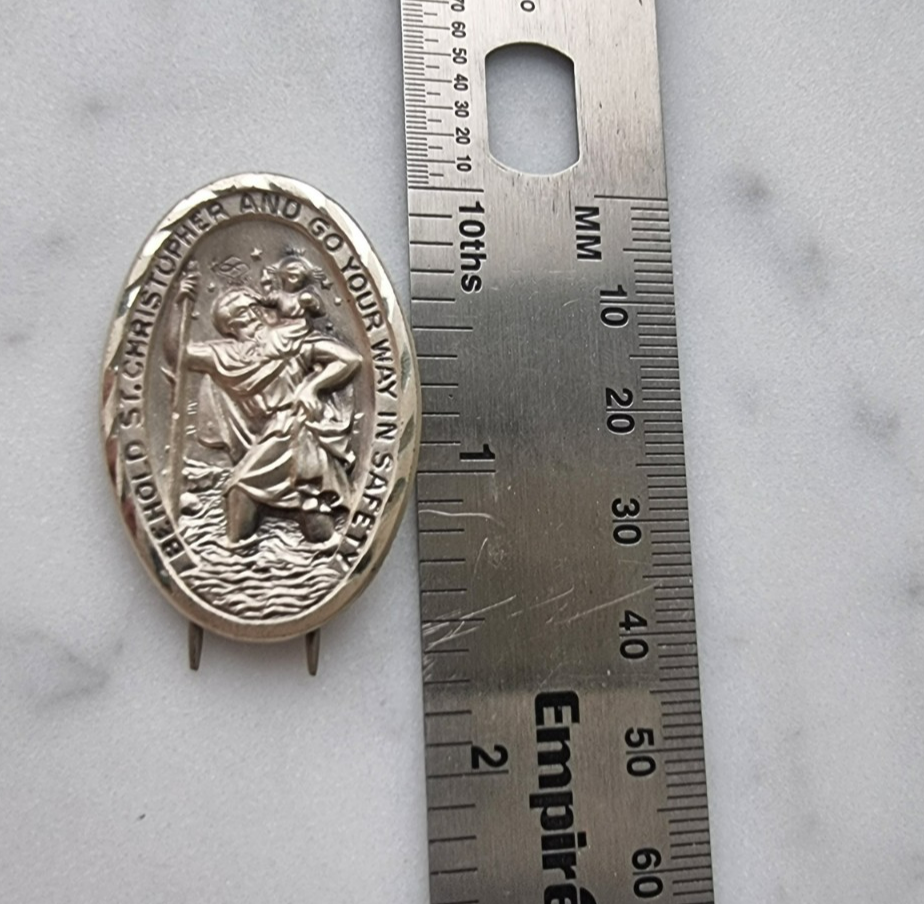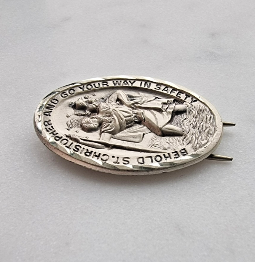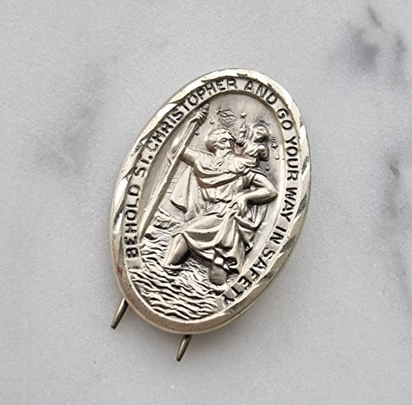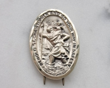 The product is a vintage sterling silver pin in the shape of St. Christopher, known for being a protector and guardian. This religious-themed driving safety gift pin features a 925 sterling silver construction, making it a meaningful and durable accessory. The silver color adds a touch of elegance, making it a unique and meaningful addition to any pin collection. Perfect for those looking for a symbol of faith and protection, this St. Christopher pin is a thoughtful and stylish gift option.