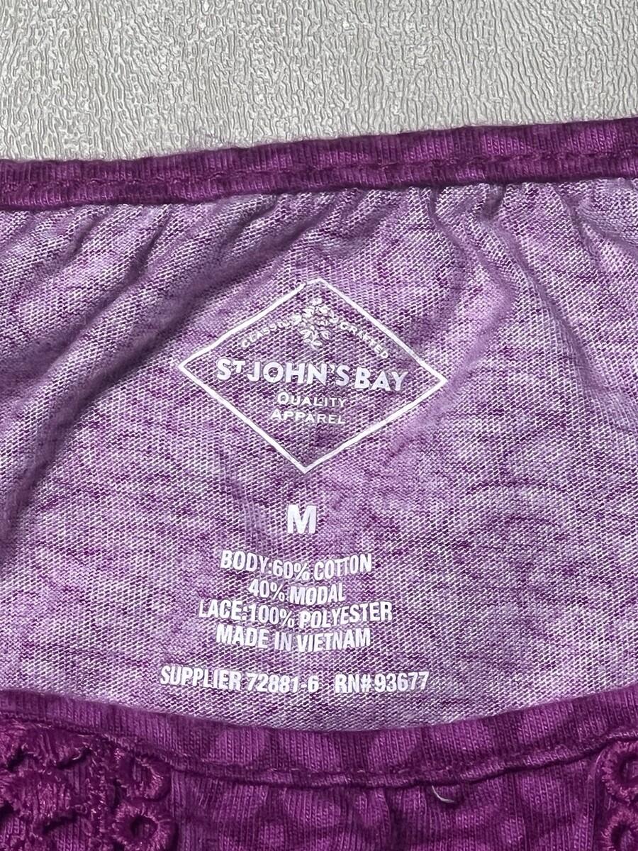 This St. John's Bay purple top features a crochet trim and pattern design, making it a stylish addition to any woman's wardrobe. The blouse is designed for regular size women in size M, adding a touch of designer flair to any outfit. The rich purple color adds a pop of color to any ensemble, making it a versatile piece that can be dressed up or down for any occasion.