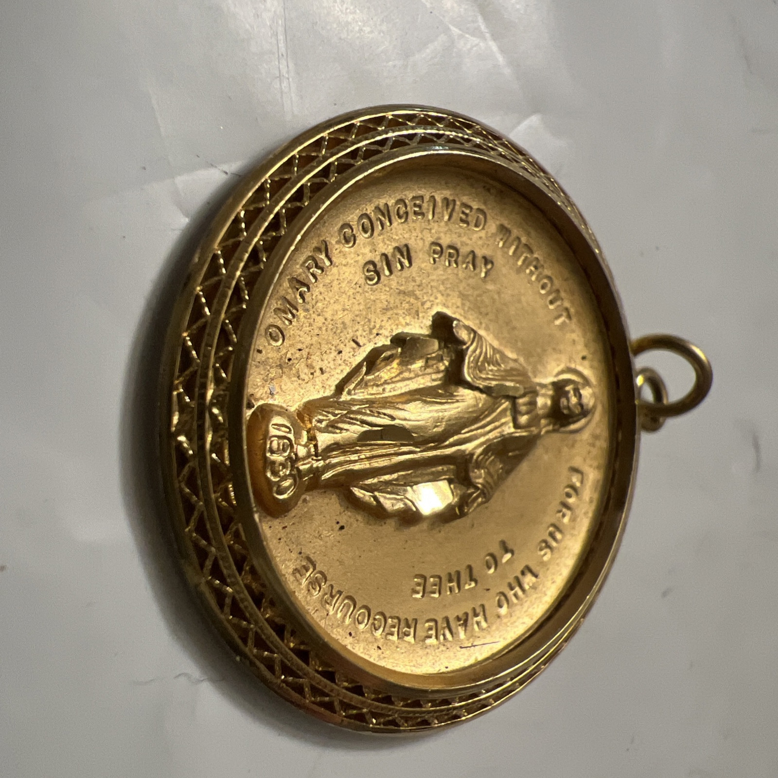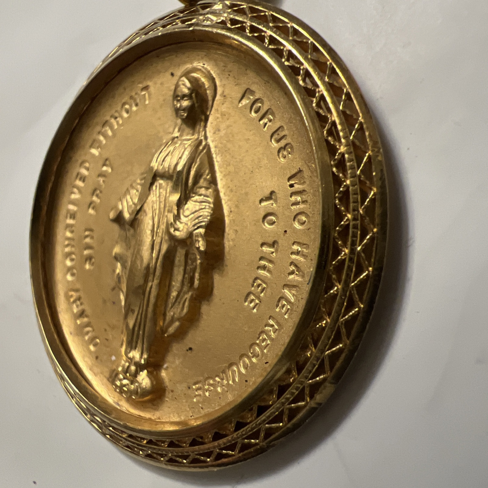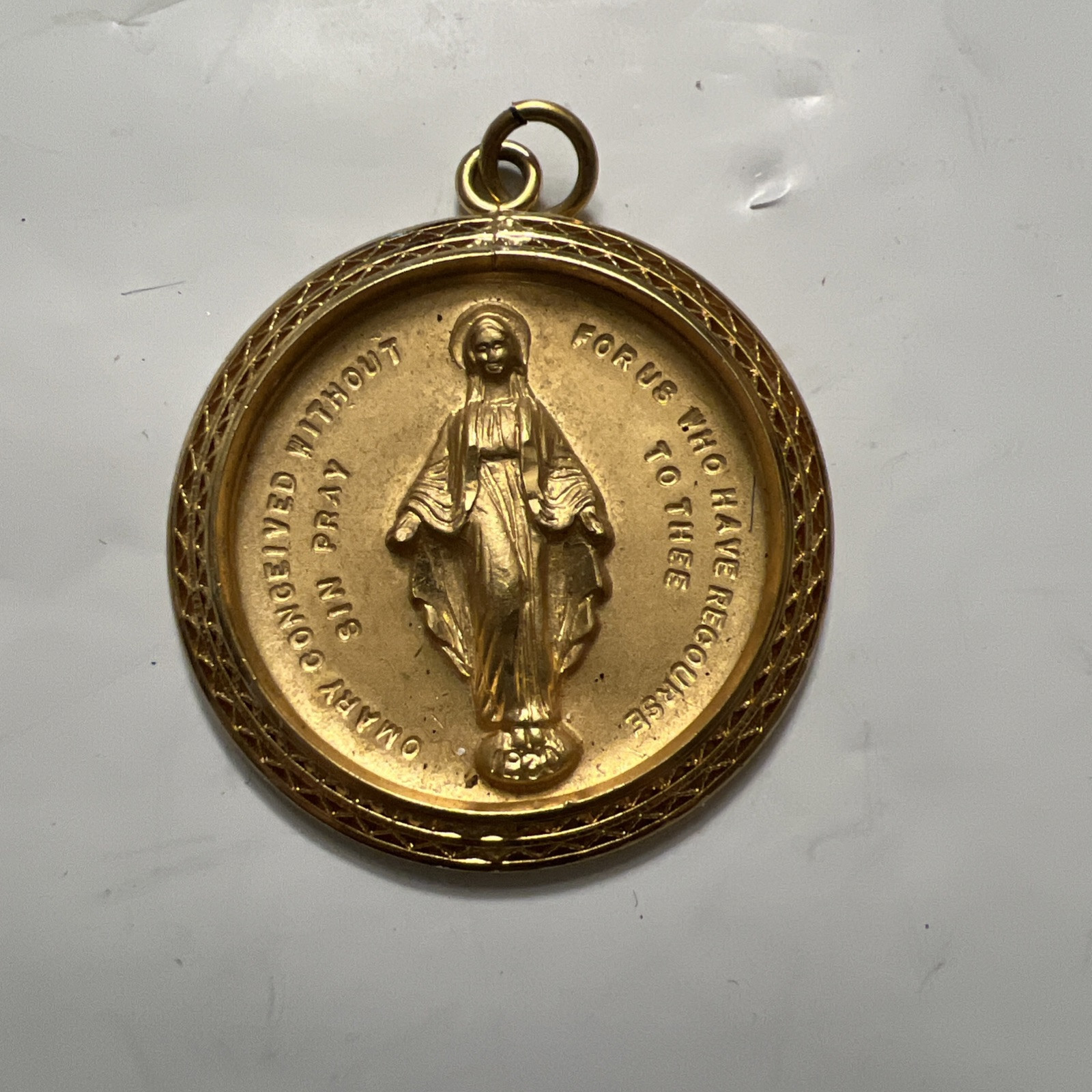 The St. Mary 1/20 12KGF Pendant is a religious medal featuring an image of St. Mary, indicating its connection to Christianity. This pendant is not handmade and has not been modified, making it a commercially produced item. The use of 12KGF in the title suggests that the pendant is made with 1/20th of 12 karat gold-filled materials, adding a touch of luxury to this religious accessory.