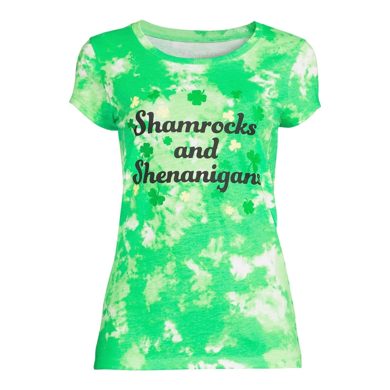St. Patrick?s Day Women's Shamrocks Graphic Tee w/ Short Sleeves, Green Size XS(1) Let the shenanigans begin. Fun Shamrock Graphic Tee is the perfect pick for St. Patrick's Day or any day fun is in the air. Cute and colorful, this short-sleeve tee makes a statement on its own or layer it with a flannel for a cozy look. Material: 60% Cotton/40% Polyester Care: Machine washable Fit: Semi-fitted Neckline Scoop neckline Closure: Pullover style Sleeves: Short Pockets: None Features: Allover print with graphic at front