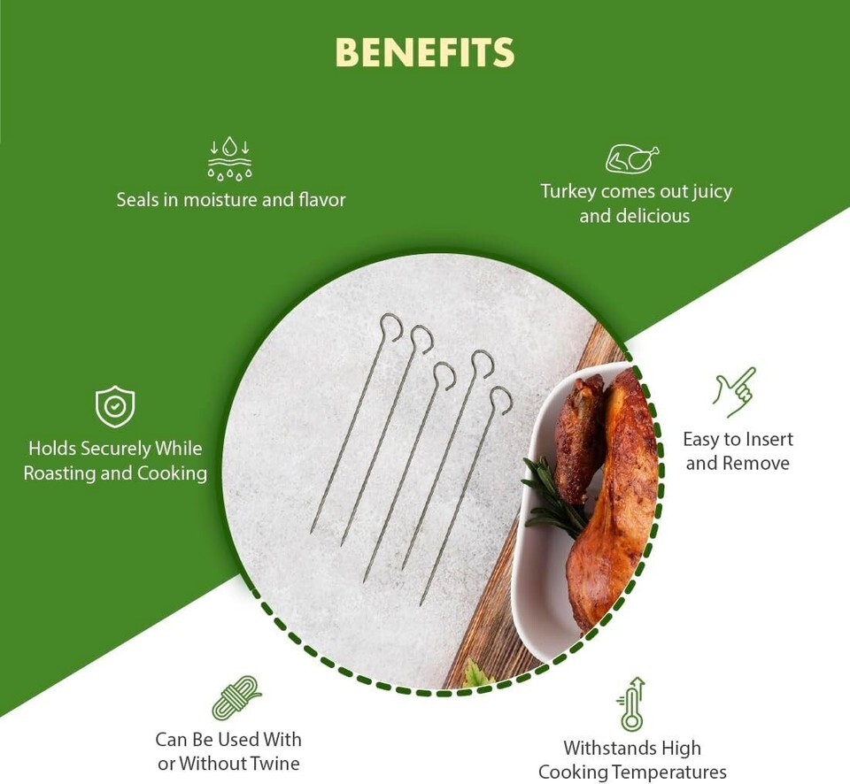 Lock in Moisture and Flavor: Secure the neck and body cavity of your turkey or chicken for juicy and flavorful results, perfect for cooking without twine.