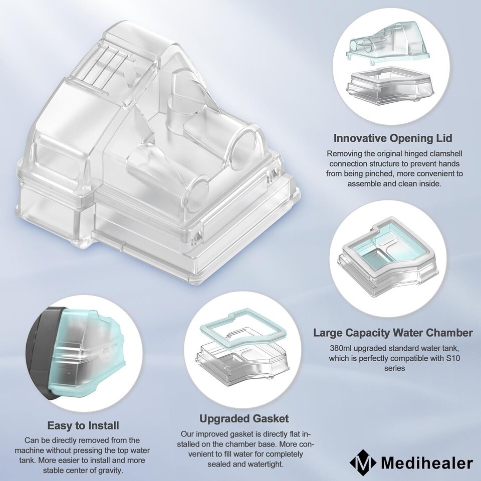 Generous 380ml capacity water tank, significantly improving compatibility and functionality (please note: compatible with AirSense 10 only, not AirSense 11).