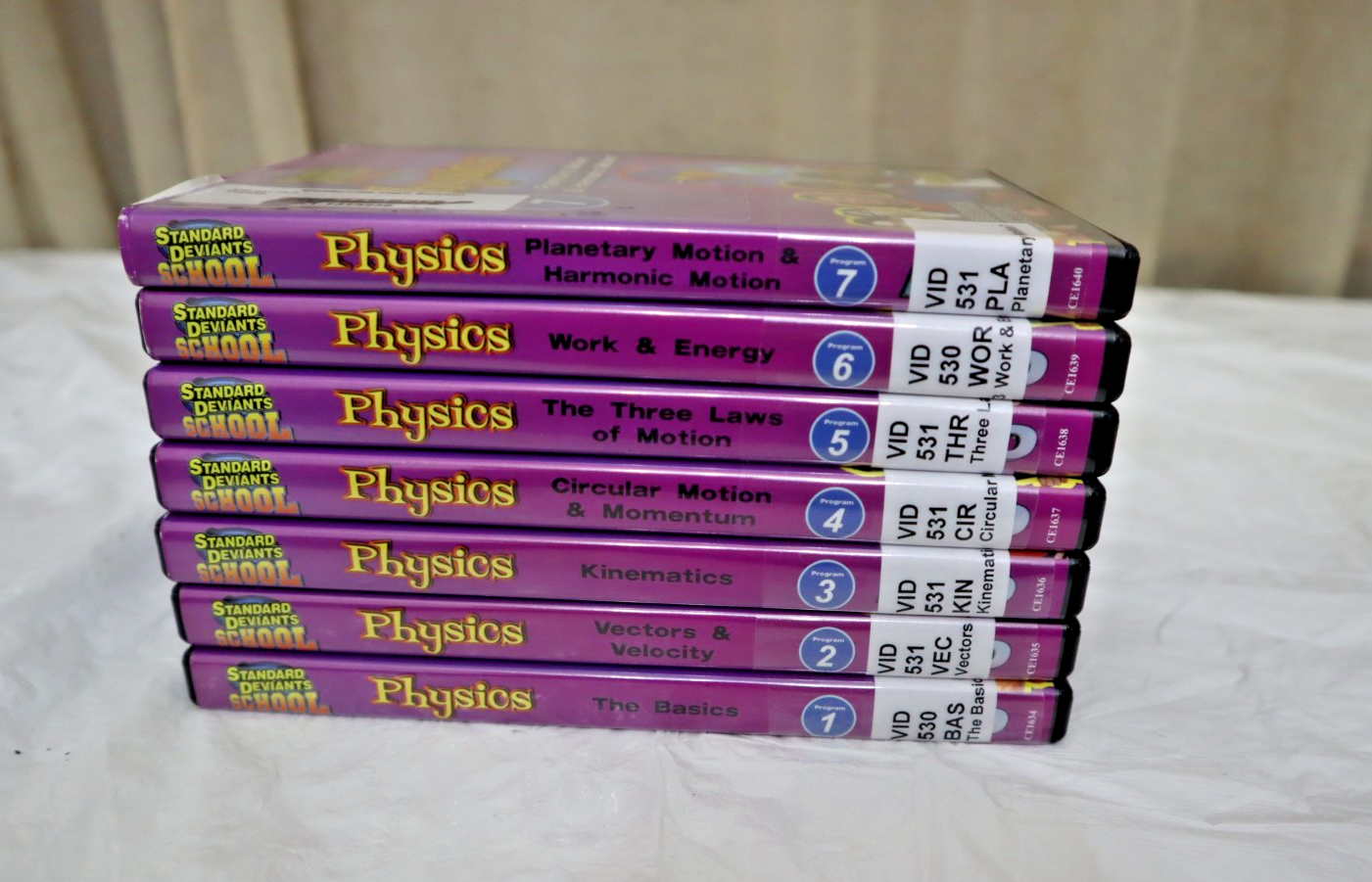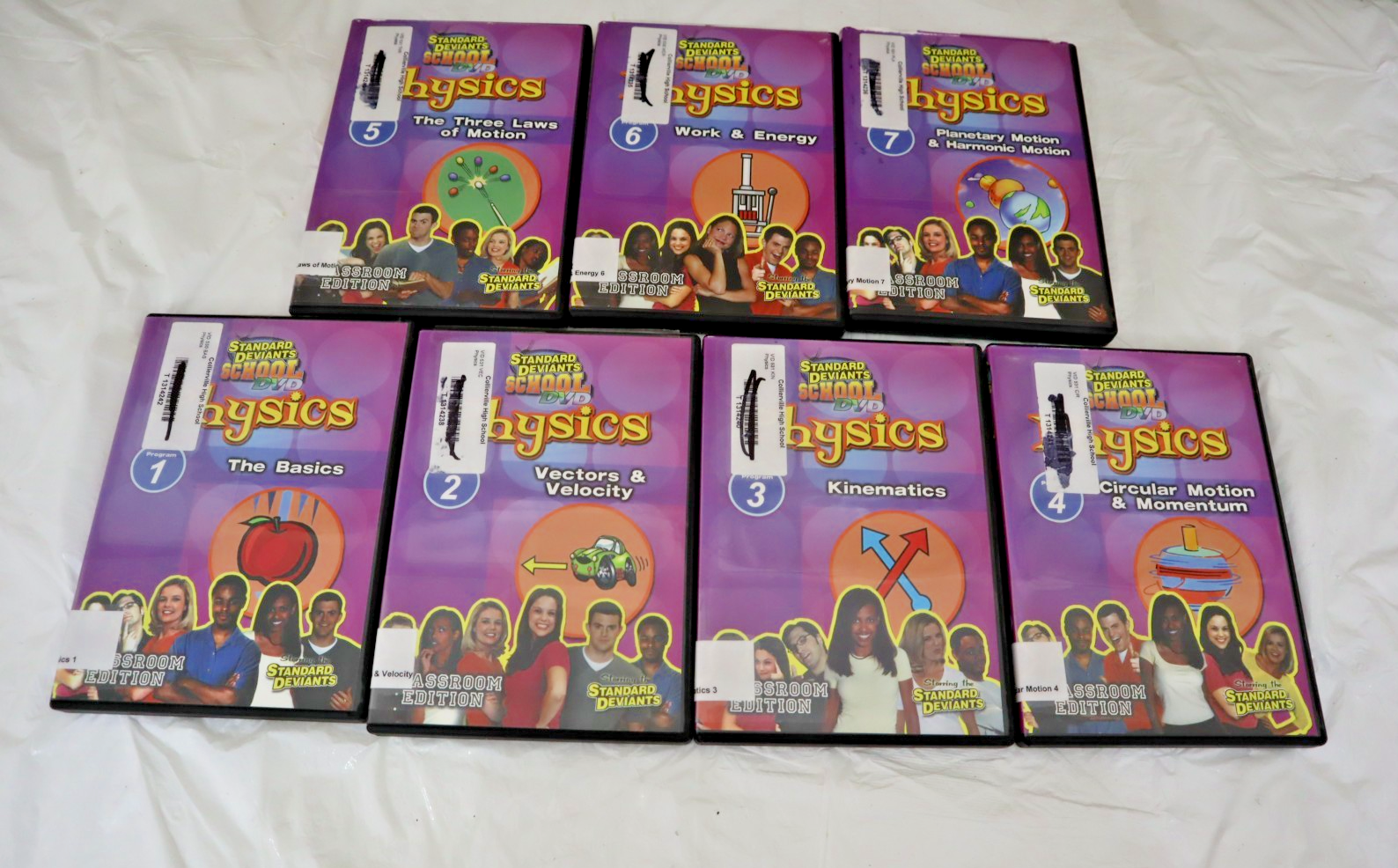 Standard Deviants School DVDs Set Physics Program 1, 2, 3, 4, 5, 6, 7 Former library copy, these DVDs are in very good condition. BXOrig1